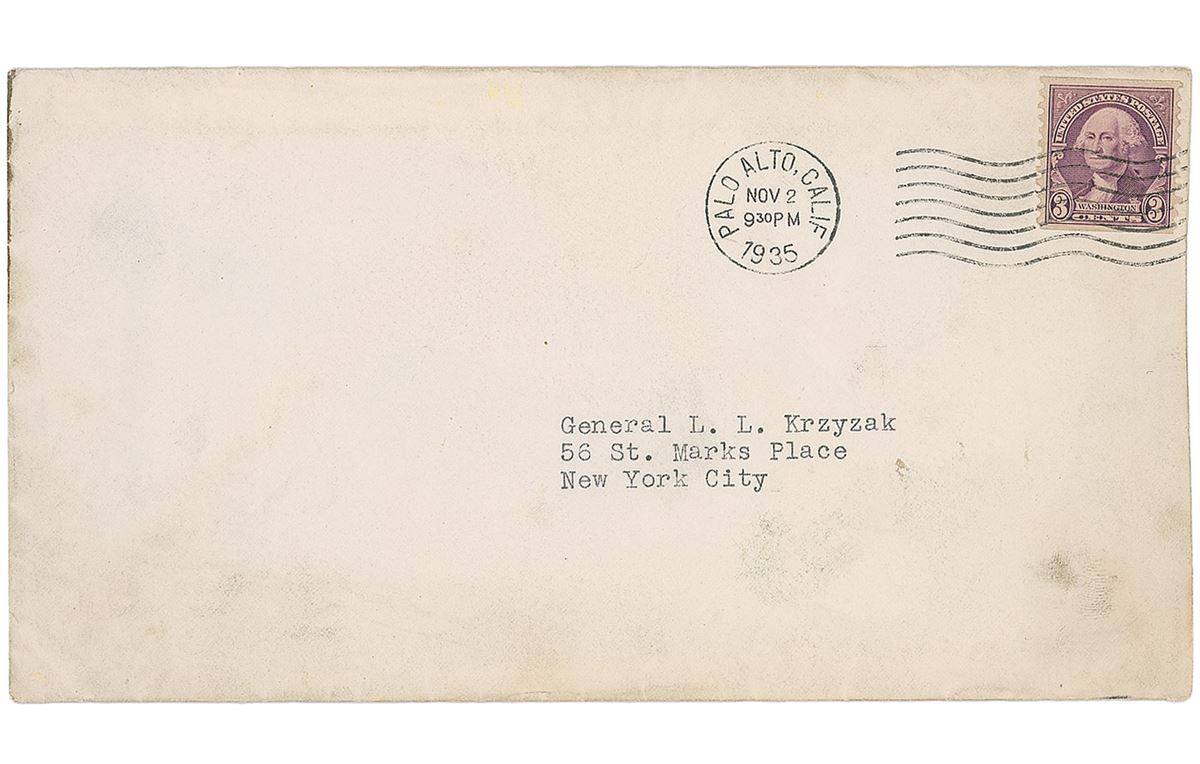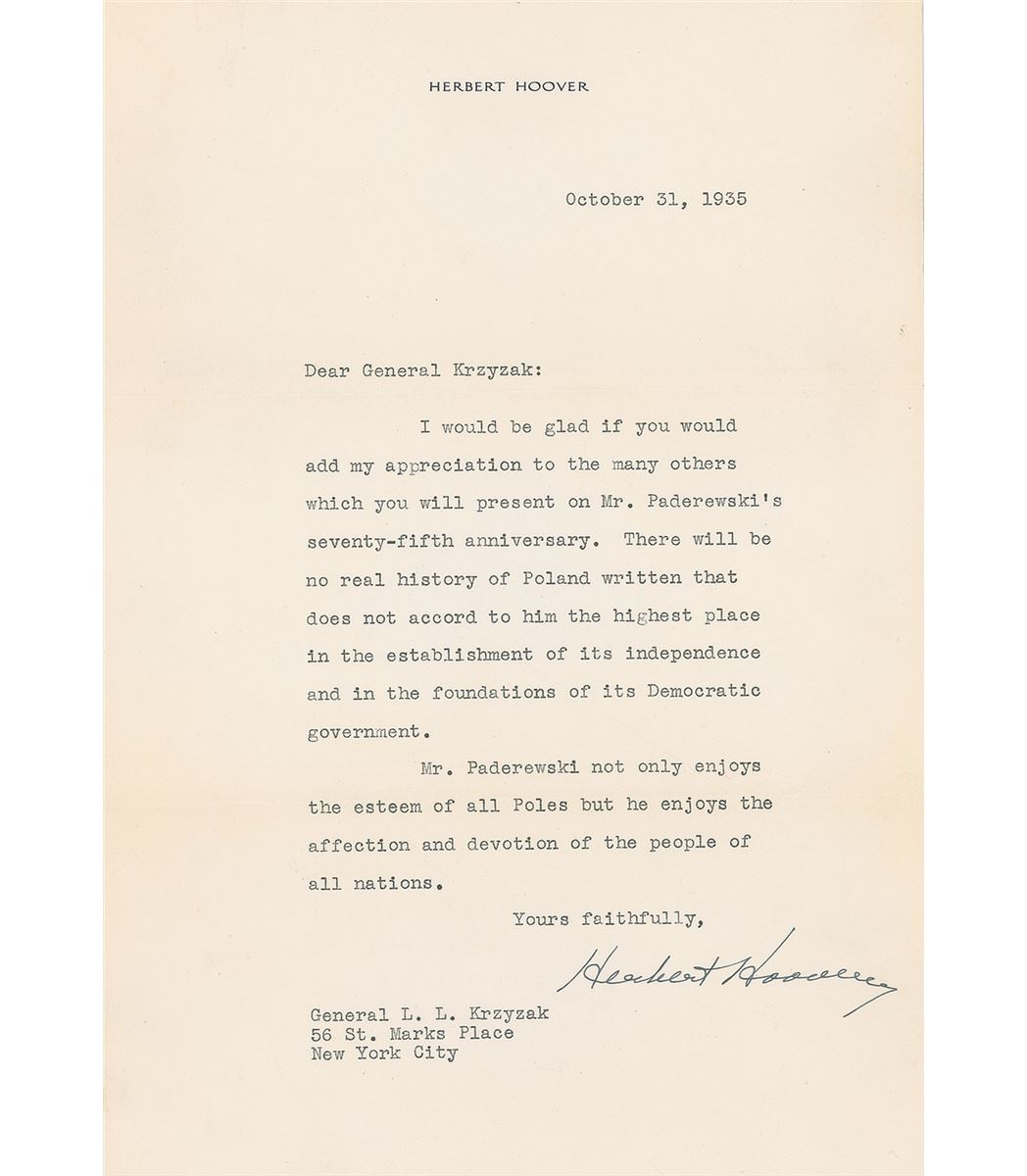 TLS, one page, 7.25 x 10.5, personal letterhead, October 31, 1935. Letter to General L. L. Krzyzak, in full: “I would be glad if you would add my appreciation to the many others which you will present on Mr. Paderewski’s seventy-fifth anniversary. There will be no real history of Poland written that does not accord to him the highest place in the establishment of its independence and in the foundations of its Democratic government. Mr. Paderewski not only enjoys the esteem of all Poles but he enjoys the affection and devotion of the people of all nations.” In fine condition. Accompanied by the original mailing envelope. The fame Ignacy Jan Paderewski earned as a revered pianist and composer enabled him to become a major spokesperson for Polish independence, serving as the country’s foreign minister and prime minister in 1919.
