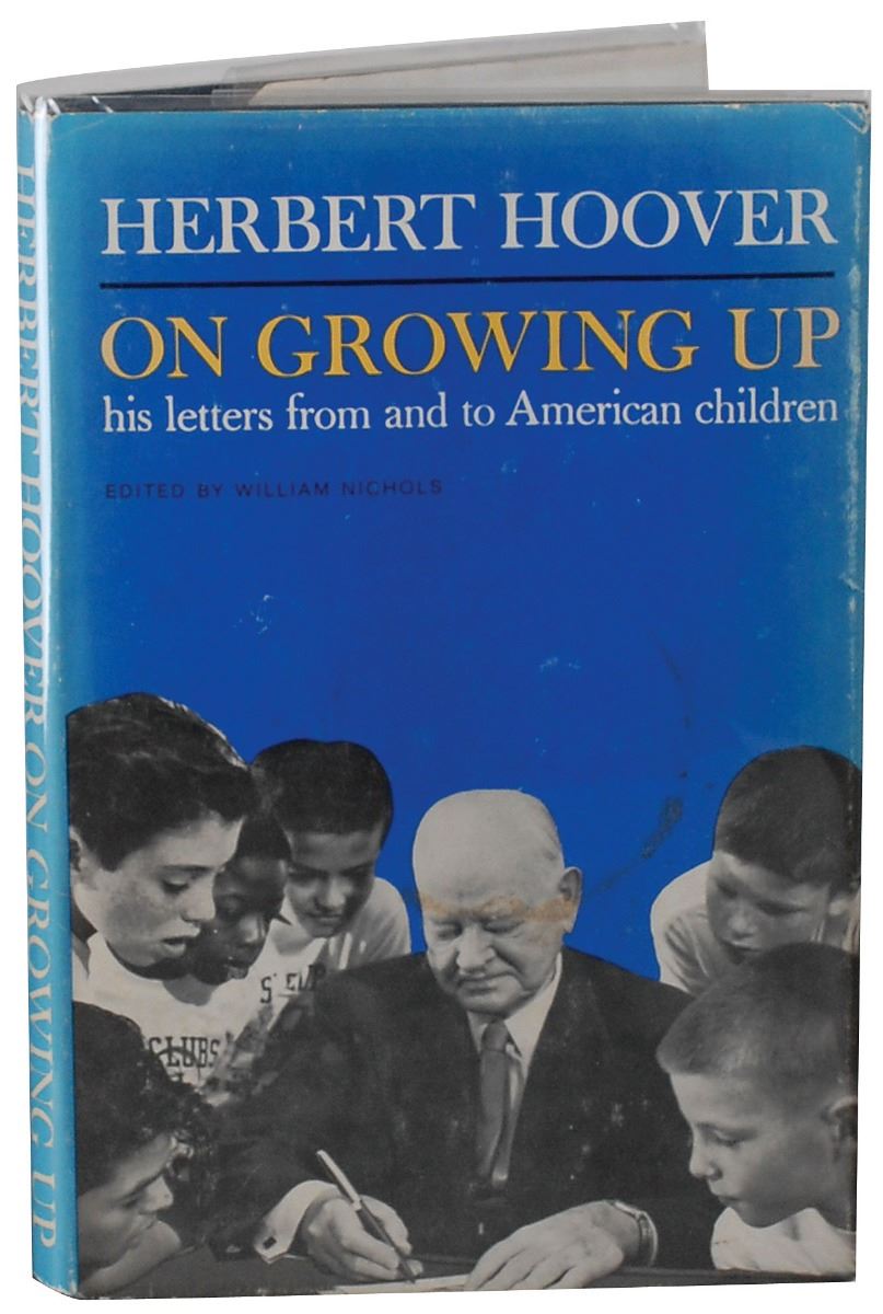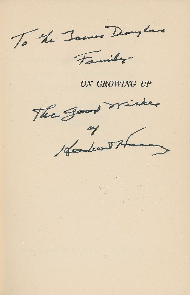 Signed book: On Growing Up. Second printing. NY: William Morrow & Company, 1962. Hardcover with dust jacket, 5.75 x 8.5, 160 pages. Signed and inscribed on the half-title page in black ink, “To the James Douglas Family—The good wishes of Herbert Hoover.” Slight toning to opening and closing pages, and some soiling, rubbing, and paper loss to dust jacket, otherwise fine condition.