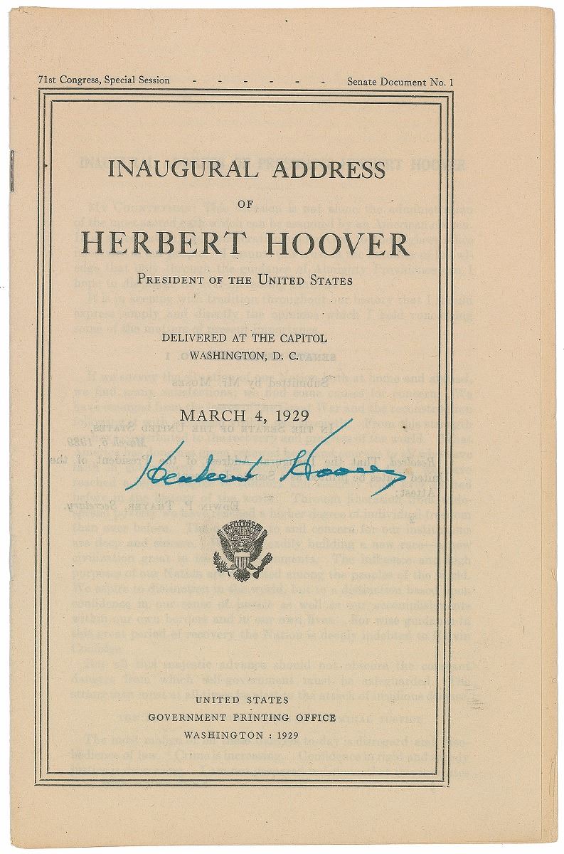 Uncommon signed booklet: Inaugural Address of Herbert Hoover. Washington: Government Printing Office, 1929. Paperback, 5.75 x 9, 11 pages. Signed on the front cover in blue ink by Hoover. In fine condition.