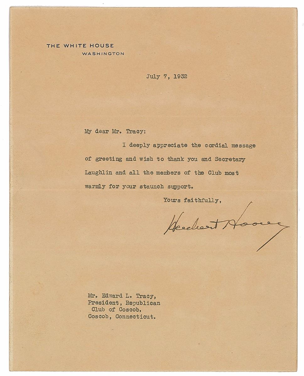 TLS as president, one page, 7 x 8.75, White House letterhead, July 7, 1932. Letter to Edward L. Tracy, in full: “I deeply appreciate the cordial message of greeting and wish to thank you and Secretary Laughlin and all the members of the Club most warmly for your staunch support.” In very good to fine condition, with overall toning.