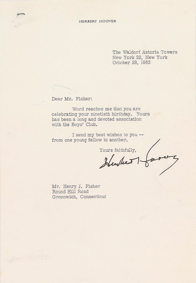 TLS, one page, 7.25 x 10.5, personal letterhead, October 28, 1963. Letter to Henry J. Fisher, in full: “Word reaches me that you are celebrating your ninetieth birthday. Yours has been a long and devoted association with the Boys’ Club. I send my best wishes to you—from one young fellow to another.” In fine condition, with a small staple to upper left corner.
