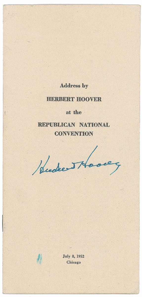 Booklet containing the address given by Hoover at the Republican National Convention in Chicago on July 8, 1952, fourteen pages, 4 x 8.25, signed on the front cover in fountain pen. In fine condition.