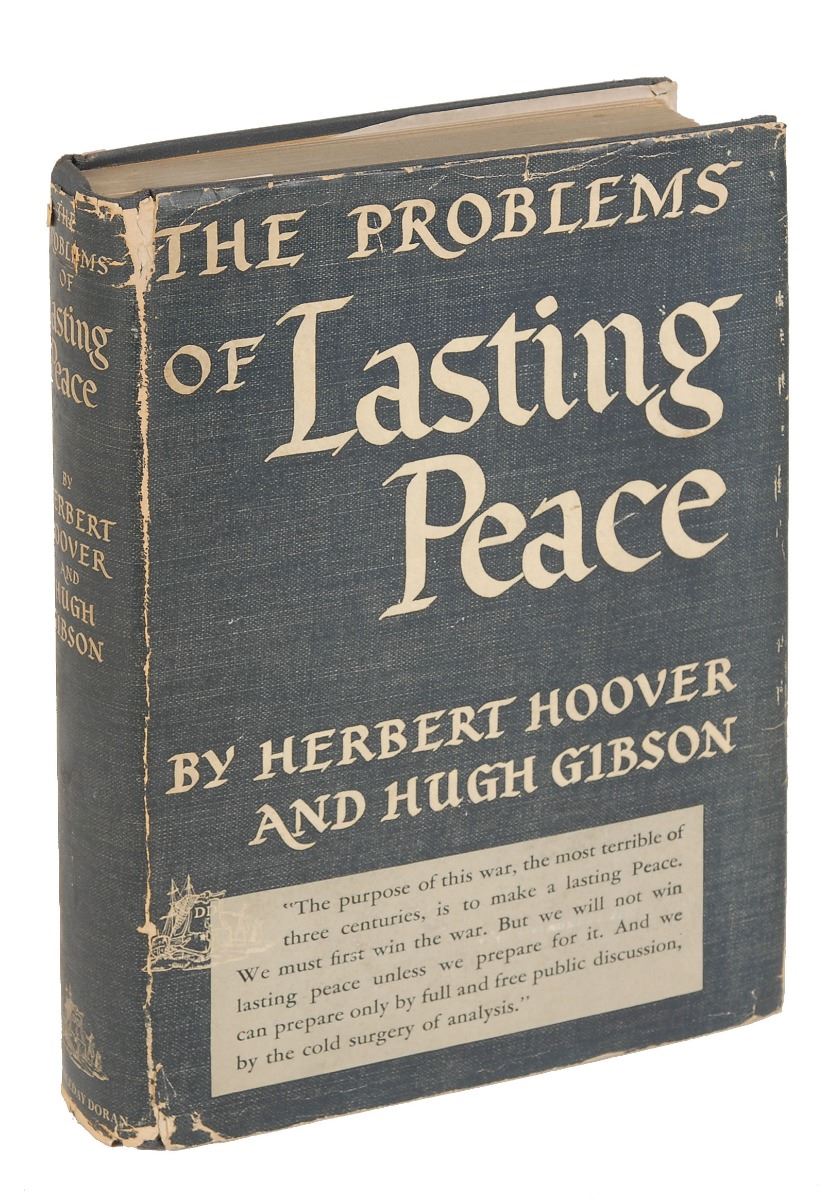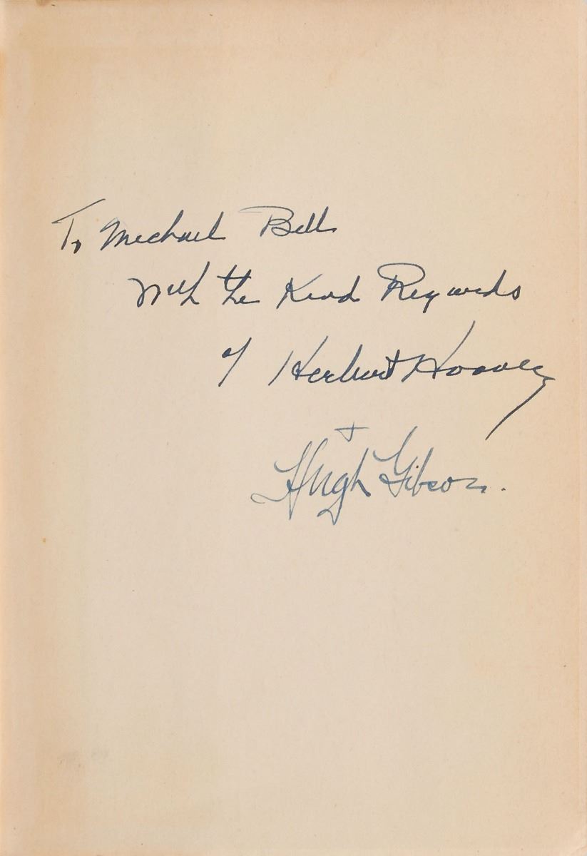 Signed book: The Problems of Lasting Peace. Third printing. NY: Doubleday, Doran and Company, Inc., 1942. Hardcover with dust jacket, 5.75 x 8, 295 pages. Signed and inscribed on the first free end page in black ink, “To Michael Bell, with the kind regards of Herbert Hoover.” Also signed by co-author Hugh Gibson. In very good to fine condition, with light irregular toning to the signed page.