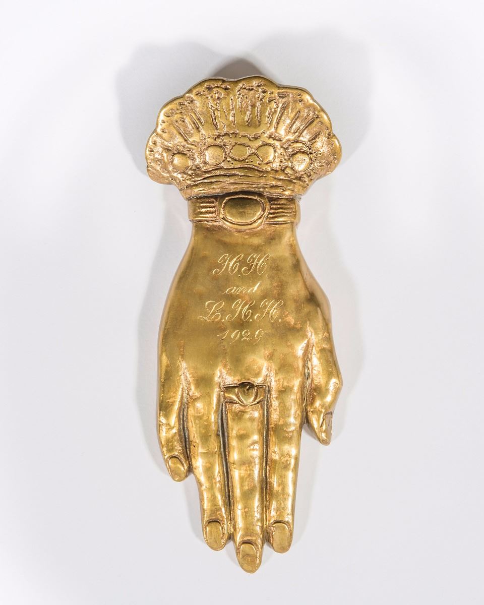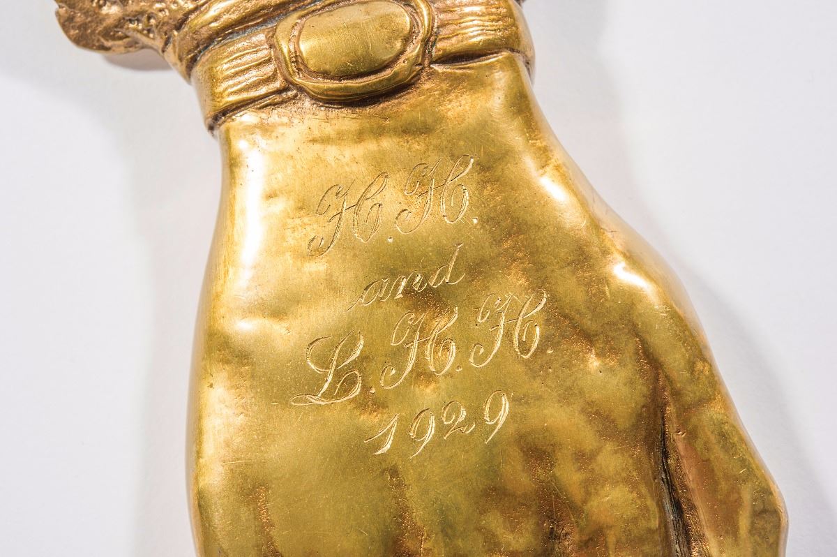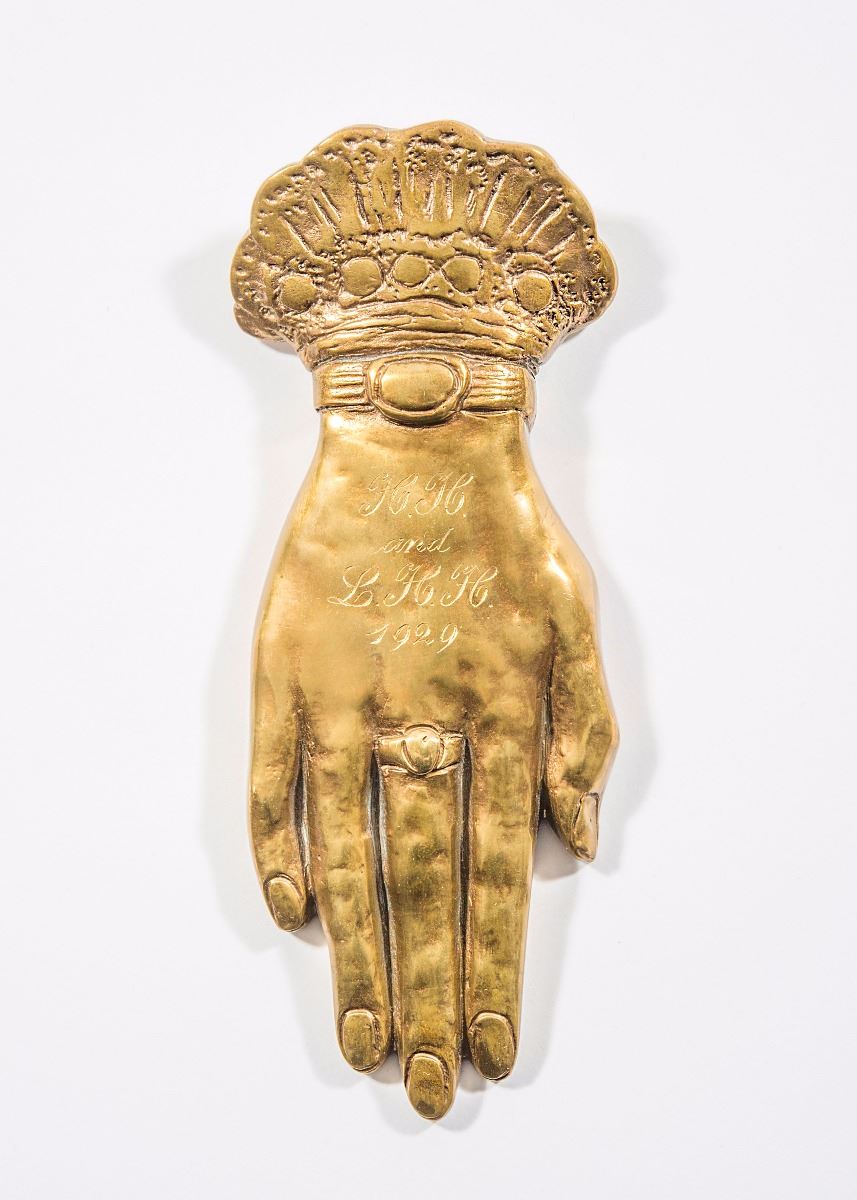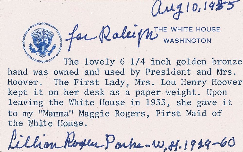 Substantial bronze paperweight in the shape of a woman’s right hand, presented by President Herbert Hoover to his wife, Lou Henry Hoover, complete with ring, bracelet, and ruffled cuff, measuring 6.25? long, and engraved along the top, “H. H. and L. H. H. 1929.” This quality paperweight was kept on Mrs. Hoover’s desk during her four-year time at the White House and gifted to Maggie Rogers, First Maid of the White House. Mrs. Rogers was often in the presence of first ladies as she performed her many duties. Accompanied by an August 10, 1985 letter of provenance, on a White House card, from Lillian Roger Parks, who was a best selling author as well as housekeeper and seamstress at the White House for over 30 years, from Hoover through Eisenhower, which reads: “The lovely 6 1/4 inch golden bronze hand was owned and used by President and Mrs. Hoover. The First Lady, Mrs. Lou Henry Hoover kept it on her desk as a paper weight. Upon leaving the White House in 1933, she gave it to my ‘Mamma’ Maggie Powers, First Maid of the White House.” In fine condition. An uncommon and very well-documented offering of a gift from a president to his wife. From the Raleigh DeGeer Amyx Collection.