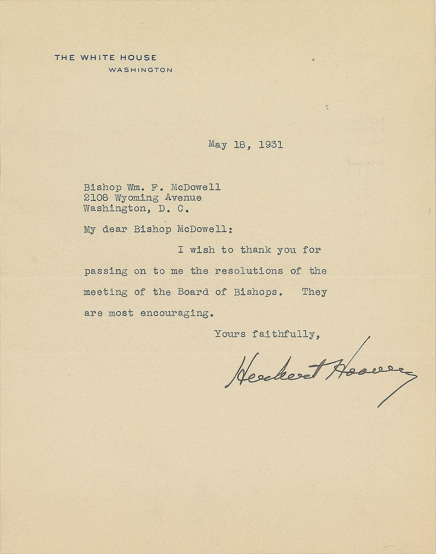 TLS as president, one page, 7 x 8.75, White House letterhead, May 18, 1931. Letter to Bishop William F. McDowell, in full: "I wish to thank you for passing on to me the resolutions of the meeting of the Board of Bishops. They are most encouraging." In fine condition. Accompanied by the original White House mailing envelope.