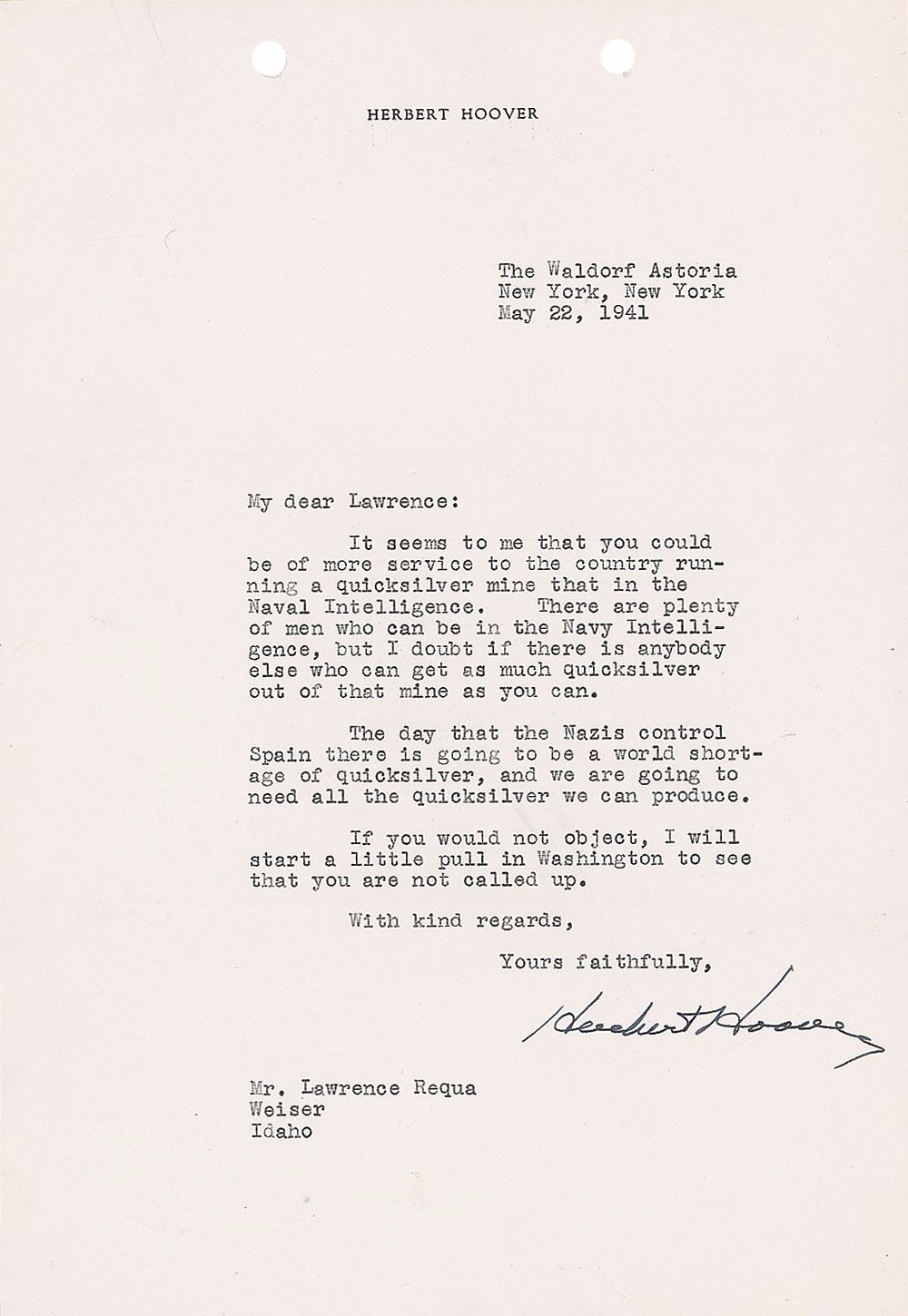 TLS, one page, 7.25 x 10.5, personal letterhead, May 22, 1941. Letter to Lawrence Requa of Idaho. In full: "It seems to me that you could be of more service to the country running a quicksilver mine that [sic] in the Naval Intelligence. There are plenty of men who can be in the Navy Intelligence, but I doubt if there is anybody else who can get as much quicksilver out of that mine as you can. The day that the Nazis control Spain there is going to be a world shortage of quicksilver, and we are going to need all the quicksilver we can produce. If you would not object, I will start a little pull in Washington to see that you are not called up." In fine condition, with filing holes to the top.