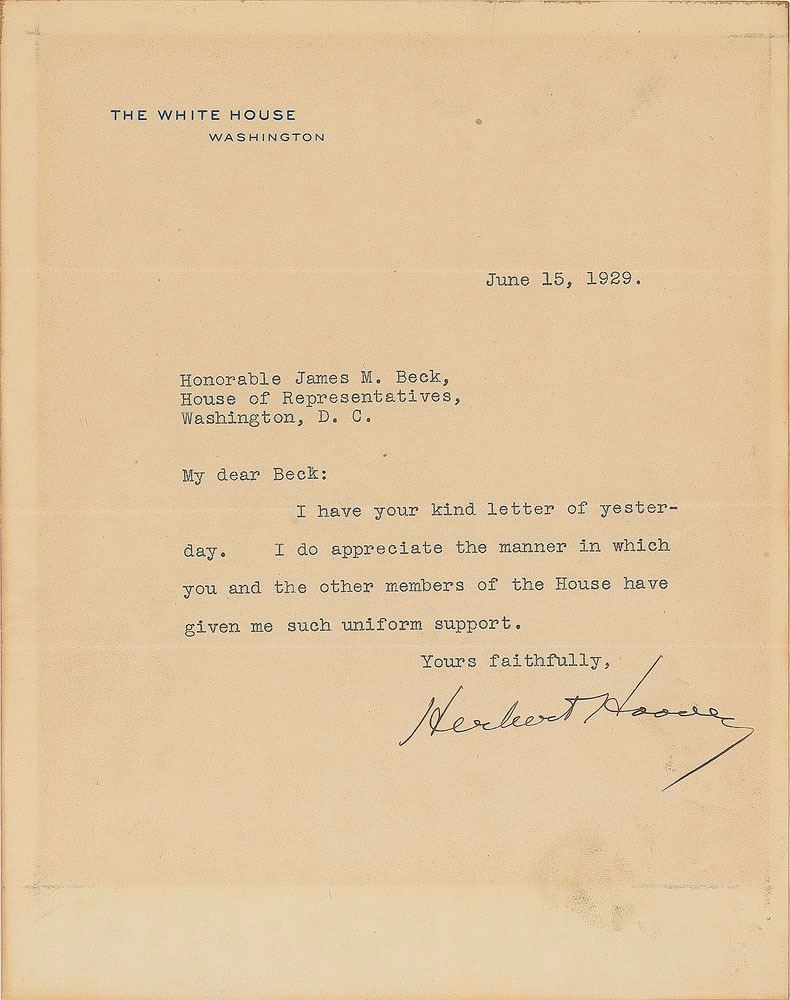 TLS as president, one page, 7 x 8.75, White House letterhead, June 15, 1929. Letter to Pennsylvanian Congressman James M. Beck, in full: "I have your kind letter of yesterday. I do appreciate the manner in which you and the other members of the House have given me such uniform support." In very good condition, with several horizontal folds, an area of soiling, and toning from prior display.