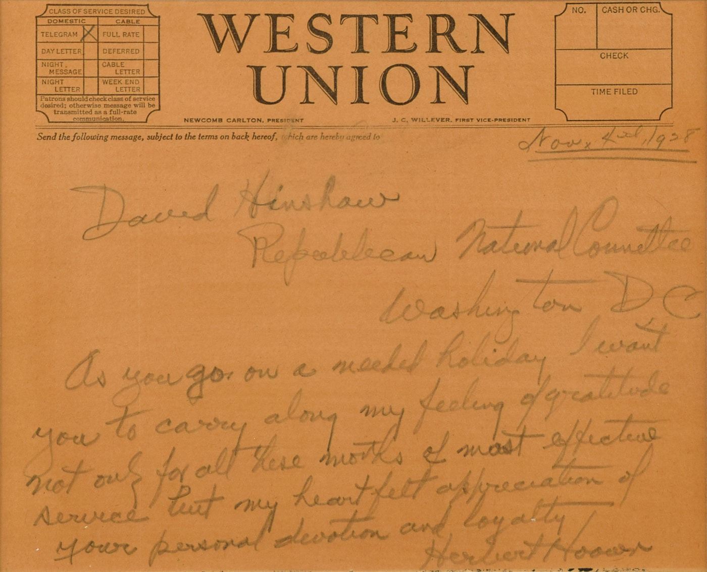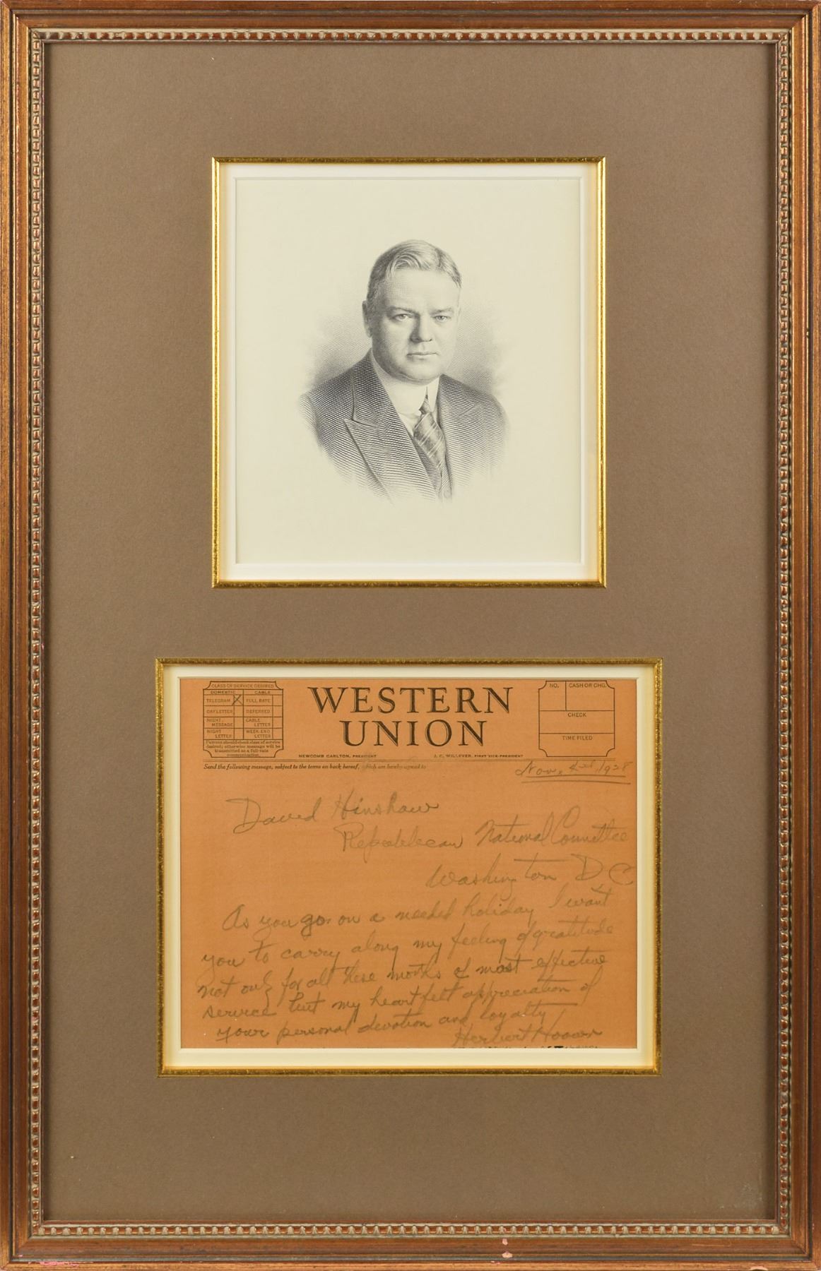Uncommon ALS in pencil, one page, 8.25 x 6.75, Western Union letterhead, November 4, 1928. Letter to "David Hinshaw, Republican National Committee," written just two days before the 1928 presidential election. In full: "As you go on a needed holiday I want you to carry along my feeling of gratitude not only for all these months of most effective service but my heartfelt appreciation of your personal devotion and loyalty." Handsomely double-matted and framed with an engraved portrait to an overall size of 14.5 x 22.5. In fine condition. Two days later, Hoover steamrolled Democratic candidate Al Smith in the presidential election, securing 444 electoral votes to Smith's meager 87. Provenance: The Albert H. Small Collection, Christie's, May 2012.