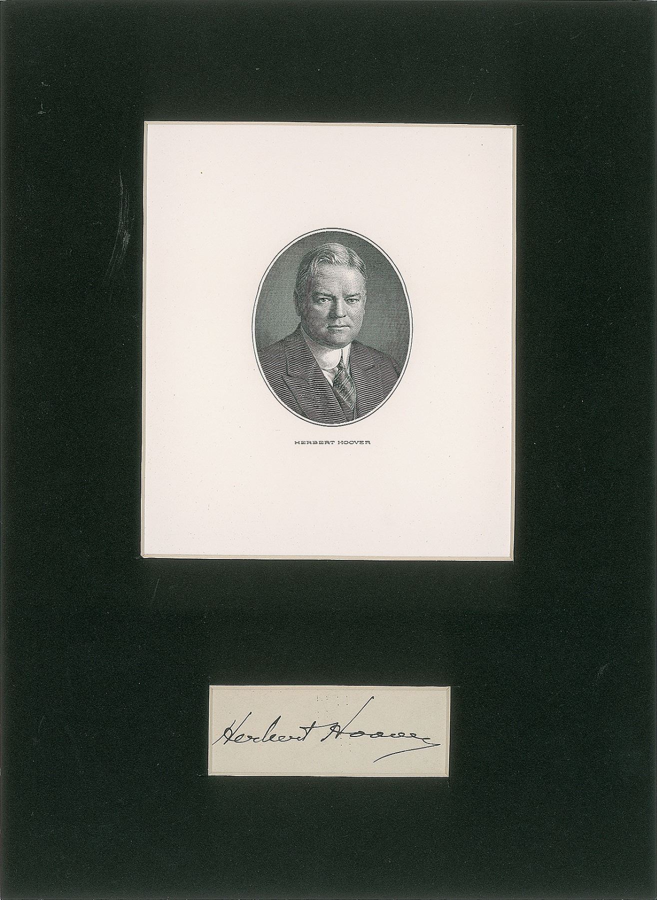 Bold fountain pen signature, "Herbert Hoover,” on an off-white 3 x 1 slip. Matted with an engraved portrait to an overall size of 8 x 11. In fine condition.