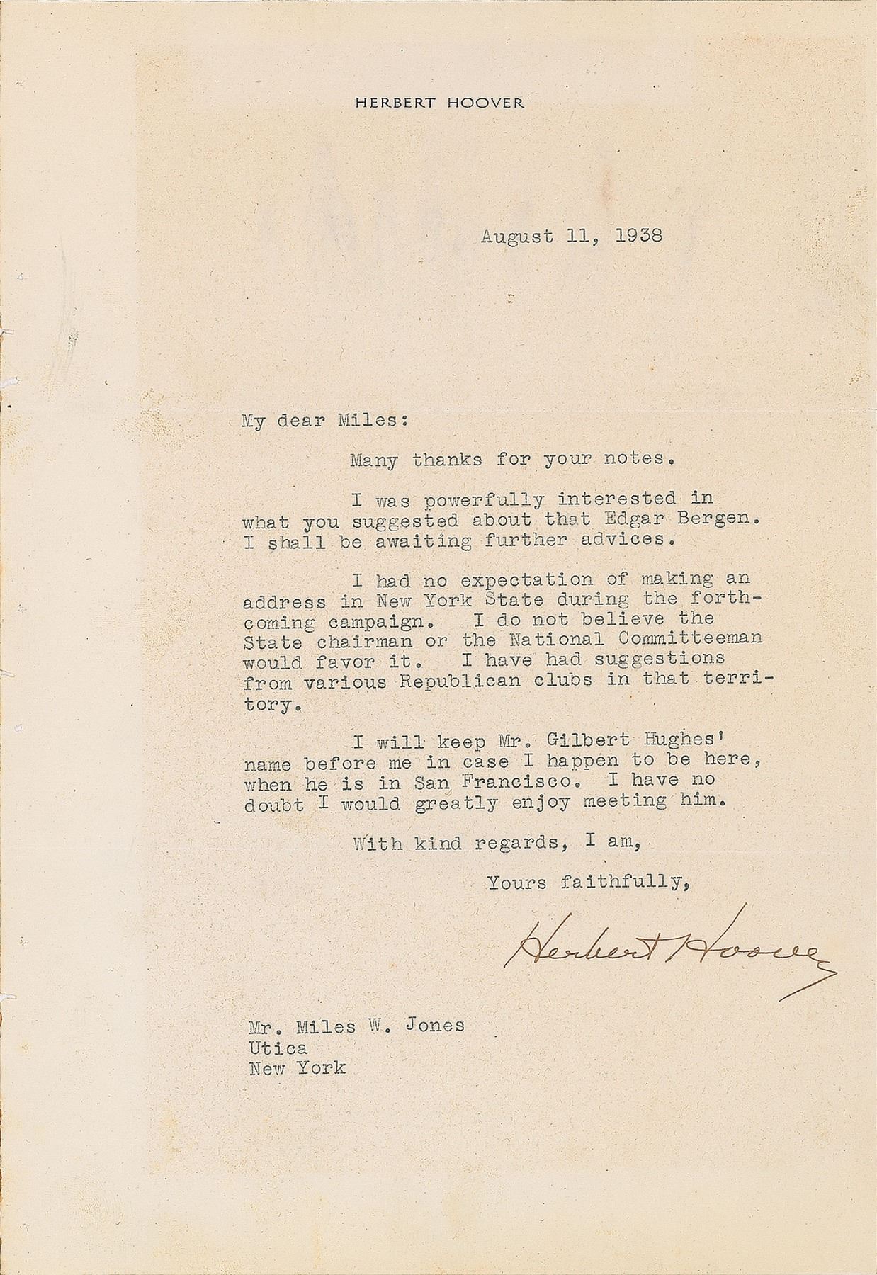 TLS, one page, 7.25 x 10.5, personal letterhead, August 11, 1938. Letter to Miles W. Jones, in part: "I was powerfully interested in what you suggested about that Edgar Bergen. I shall be awaiting further advices. I had no expectation of making an address in New York State during the forthcoming campaign. I do not believe the State chairman or the National Committeeman would favor it. I have had suggestions from various Republican clubs in that territory. I will keep Mr. Gilbert Hughes' name before me in case I happen to be here, when he is in San Francisco. I have no doubt I would greatly enjoy meeting him." In very good to fine condition, with binding holes along the left edge, and a light block of toning from prior display.