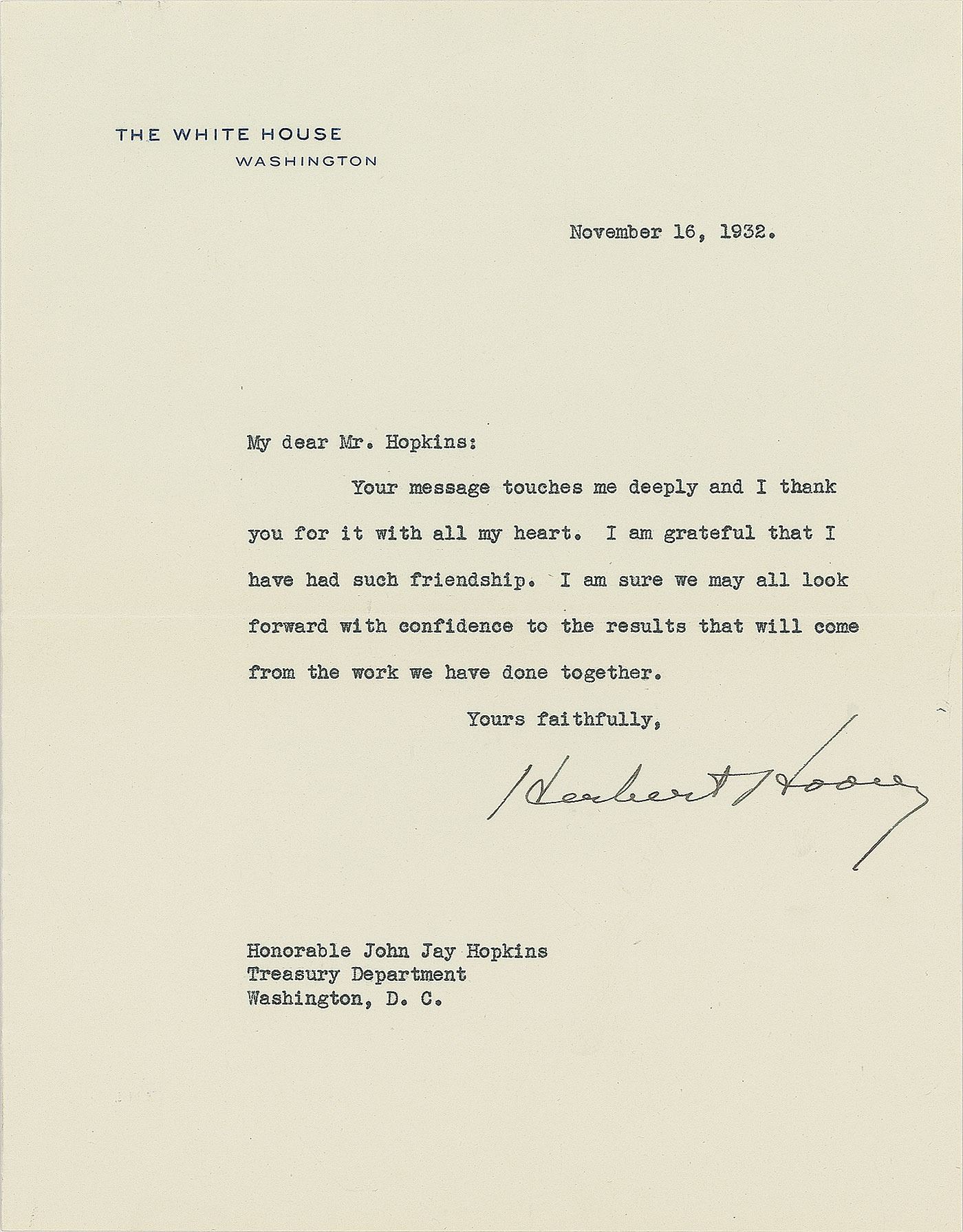 TLS as president, one page, 7 x 8.75, White House letterhead, November 16, 1932. Letter to John Jay Hopkins of the Treasury Department, in full: "Your message touches me deeply and I thank you for it with all my heart. I am grateful that I have had such friendship. I am sure we may all look forward with confidence to the results that will come from the work we have done together." In fine condition. Accompanied by the original White House mailing envelope. Democrat Franklin D. Roosevelt defeated incumbent Republican President Herbert Hoover in the 1932 presidential election just eight days before this letter was written.