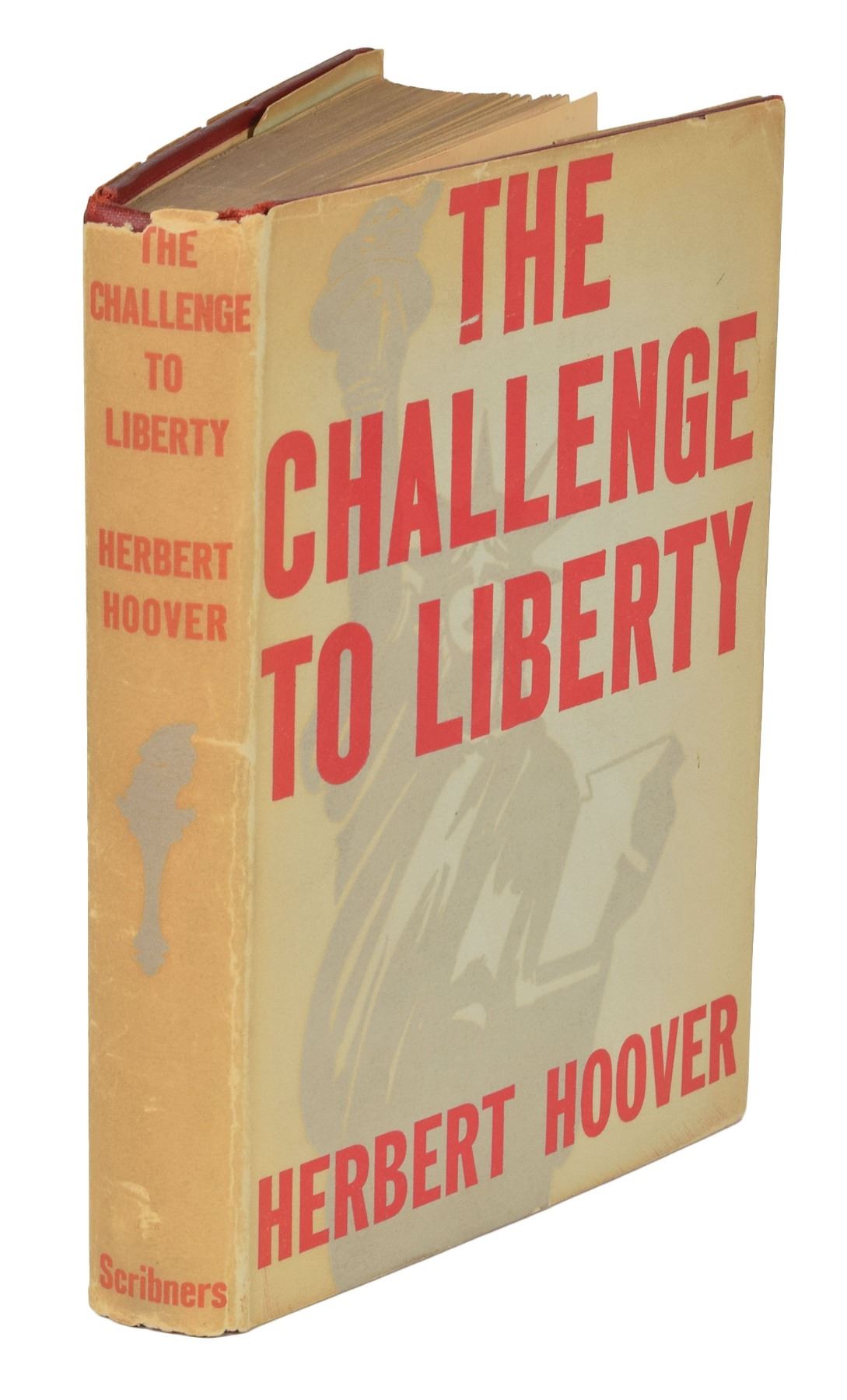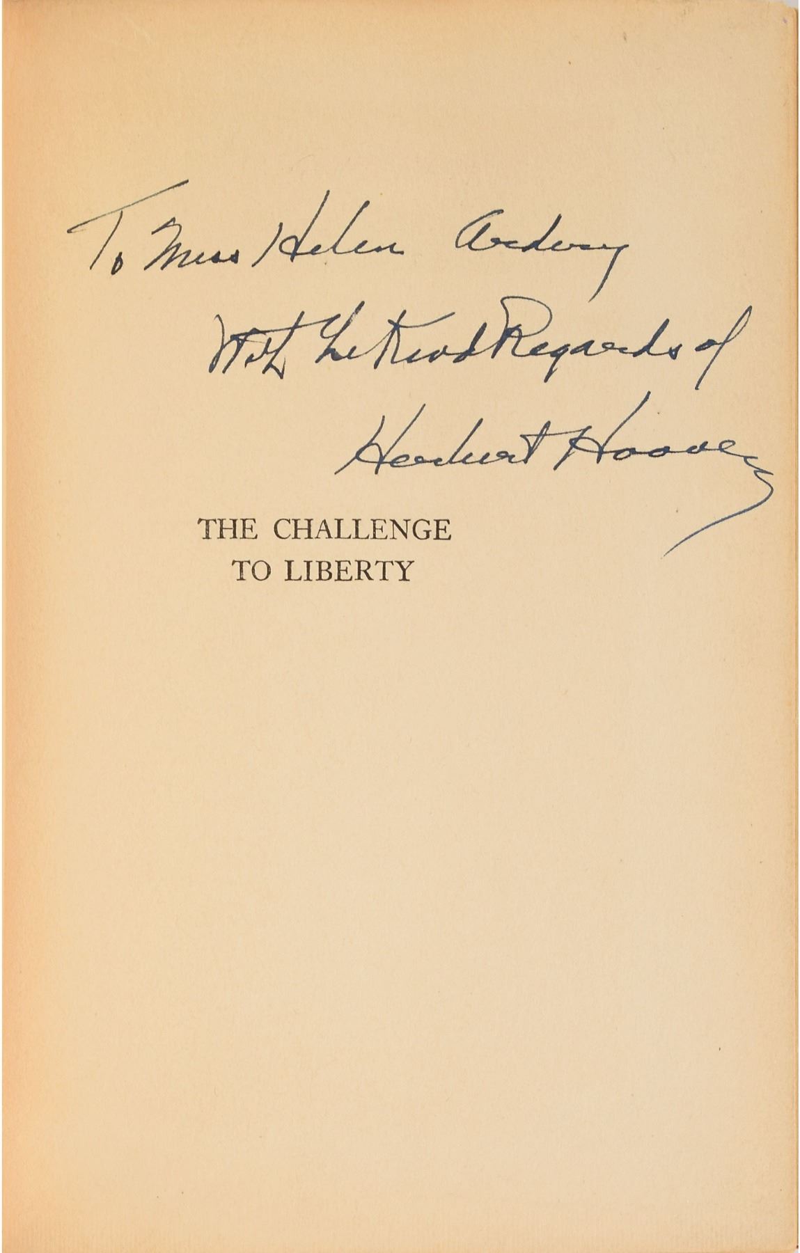Signed book: The Challenge to Liberty. First edition. NY: Charles Scribner's Sons, 1934. Hardcover with dust jacket, 5.75 x 7.75, 212 pages. Signed and inscribed on the half-title page in black ink, "To Mrs. Helen Ardery, With the Kind Regards of Herbert Hoover." In fine condition, with a "compliments of Herbert Hoover" card glued to the first free end page, and chipping and toning to the dust jacket.