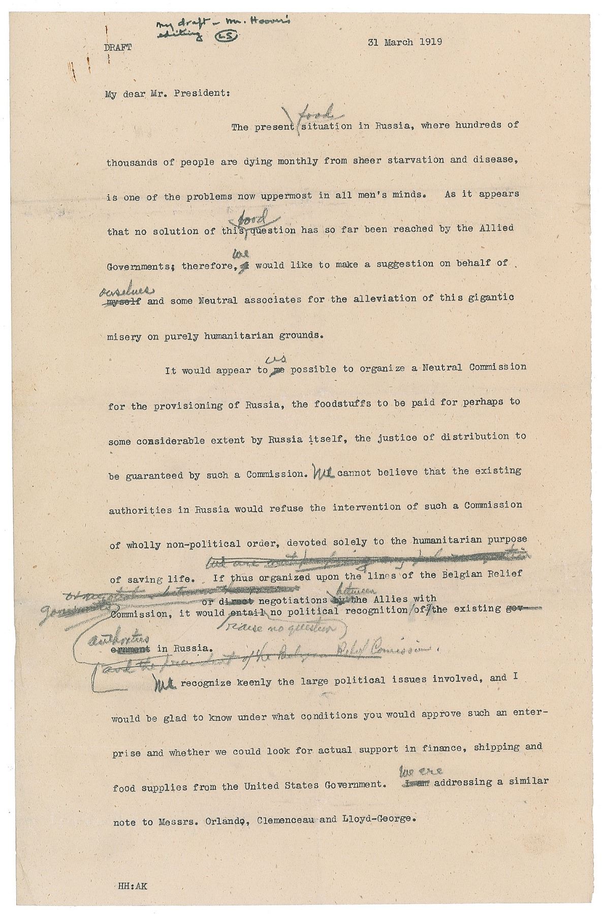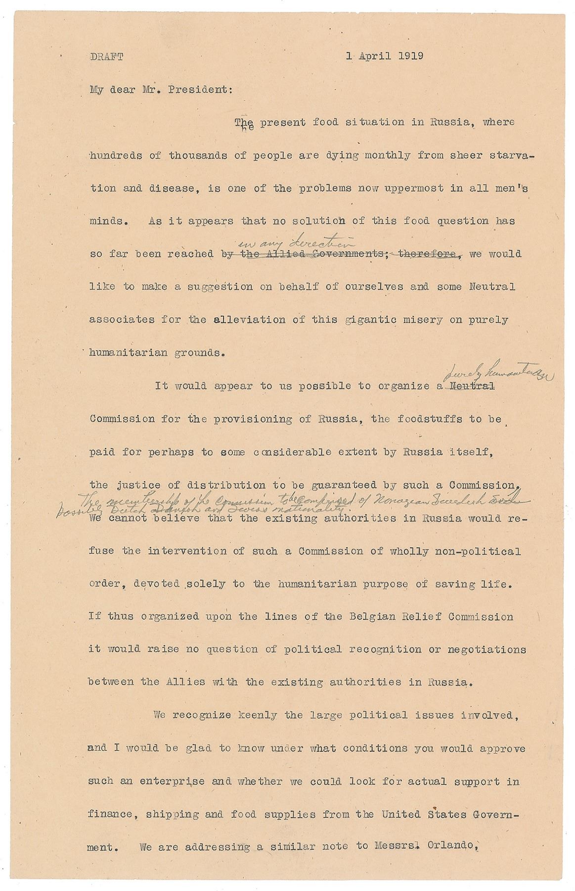 It would appear to us possible to organize a Neutral Commission for the provisioning of Russia, the foodstuffs to be paid for perhaps to some considerable extent by Russia itself, the justice of distribution to be guaranteed by such a Commission. We cannot believe that the existing authorities in Russia would refuse the intervention of such a Commission of wholly non-political order, devoted solely to the humanitarian purpose of saving life.” Here, several insertions in Hoover’s hand have been struck through, and the letter continues: “If thus organized upon the lines of the Belgian Relief Commission, it would raise no question [of] political recognition or negotiations between the Allies with the existing authorities in Russia."