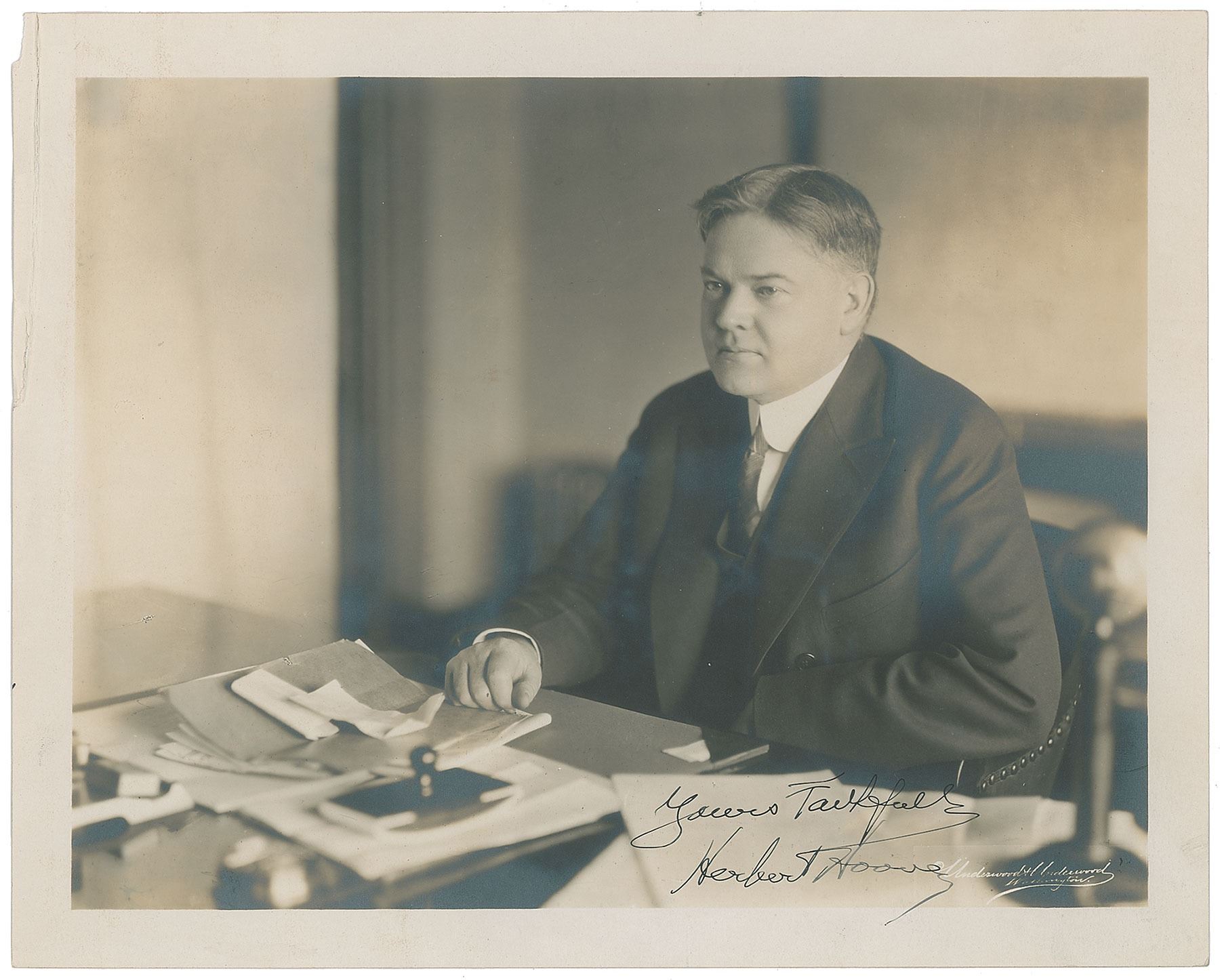 Vintage matte-finish 10 x 8 seated photo of Hoover by Underwood & Underwood of Washington, D.C., signed in black ink, "Yours faithfully, Herbert Hoover." In very good condition, with moderate overall silvering, and a crease/tear to the upper left border.