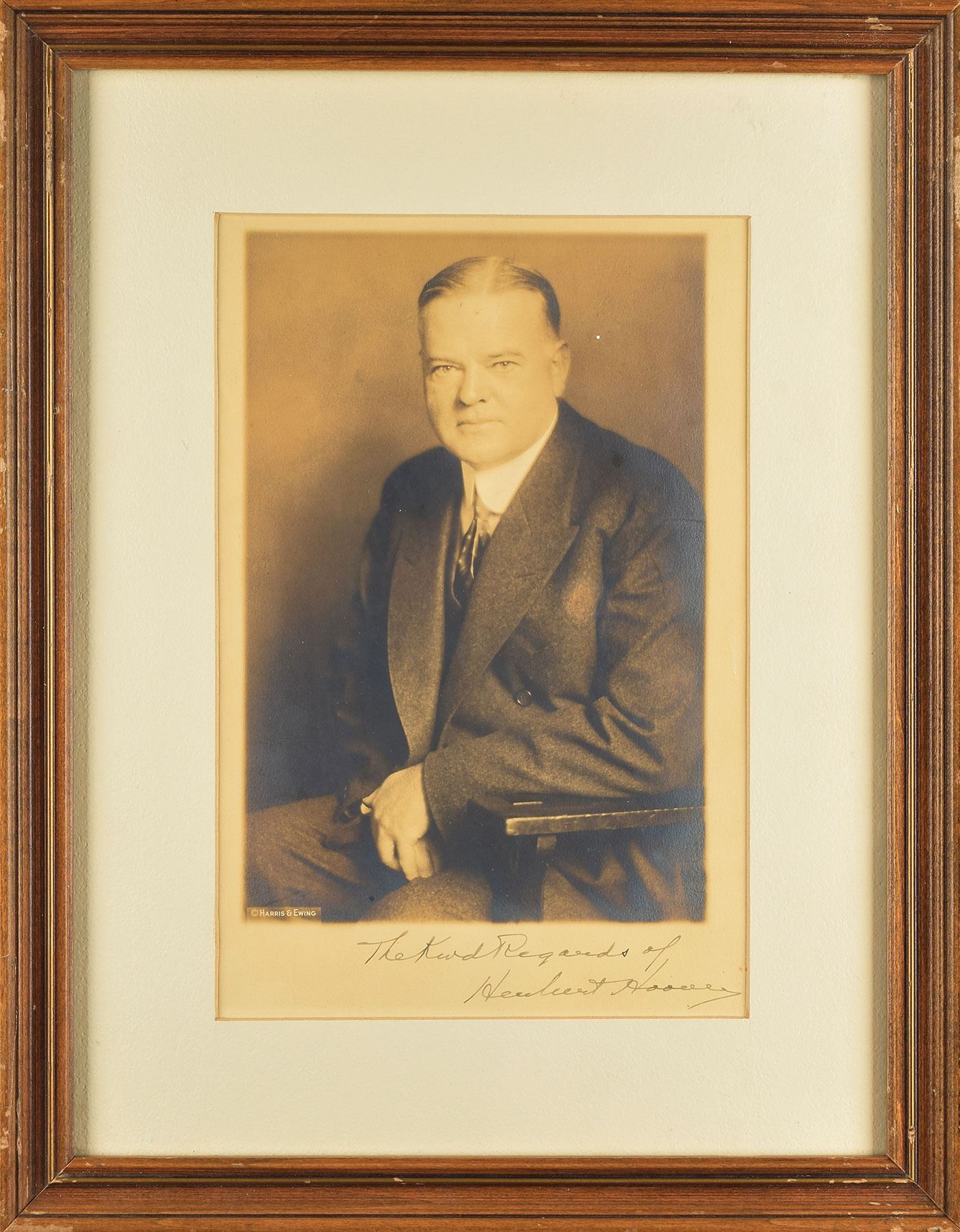 Handsome matte-finish 7 x 10.5 portrait of Hoover in a suit and tie by Harris & Ewing, signed in the lower border in fountain pen, "The Kind Regards of Herbert Hoover." Matted and framed to an overall size of 12.5 x 16. In fine condition, with light silvering to the darker areas of the image.