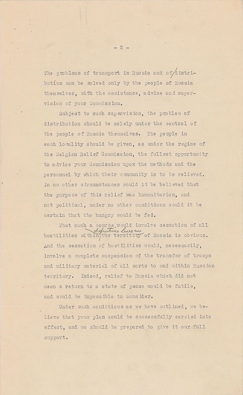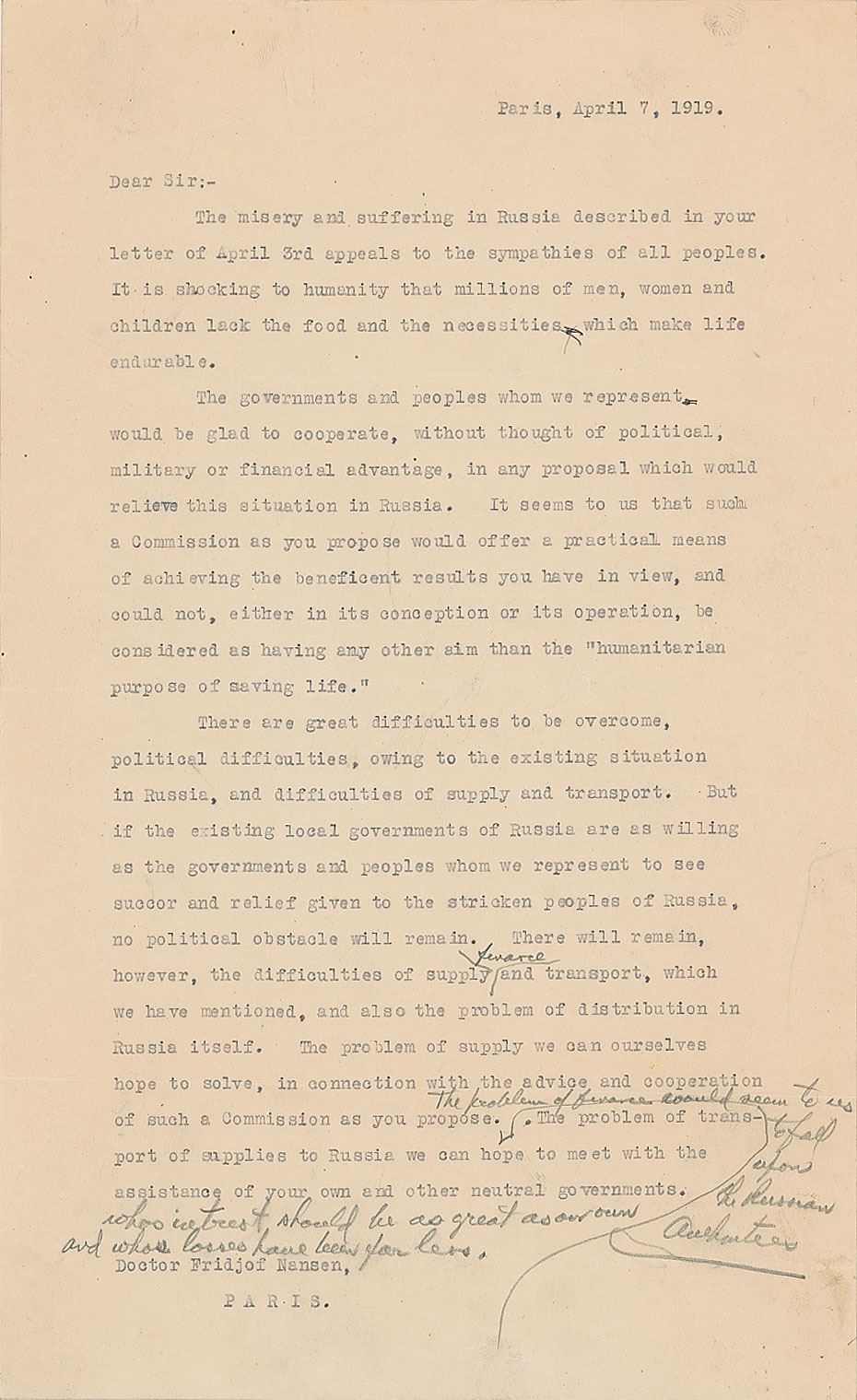 Hand-corrected telegram draft, two pages, 8 x 13, April 7, 1919. A draft of the response by the 'Big Four' (American President Woodrow Wilson, French Prime Minister Georges Clemenceau, British Prime Minister David Lloyd George, and Italian Prime Minister Vittorio Orlando), to Norwegian explorer and humanitarian Fridtjof Nansen's plea for food aid to Russia, hand-corrected in pencil by Herbert Hoover in an attempt to navigate the complicated politics surrounding the request. His most substantial change, in part (Hoover's corrections shown in italics): "The problem of finance would seem to us to fall upon the Russian authorities whose interest should be as great as our own and whose losses have been far less. The problem of transport of supplies to Russia we can hope to meet with the assistance of your own and other neutral governments." In fine condition, with a paperclip impression to the top of each sheet.