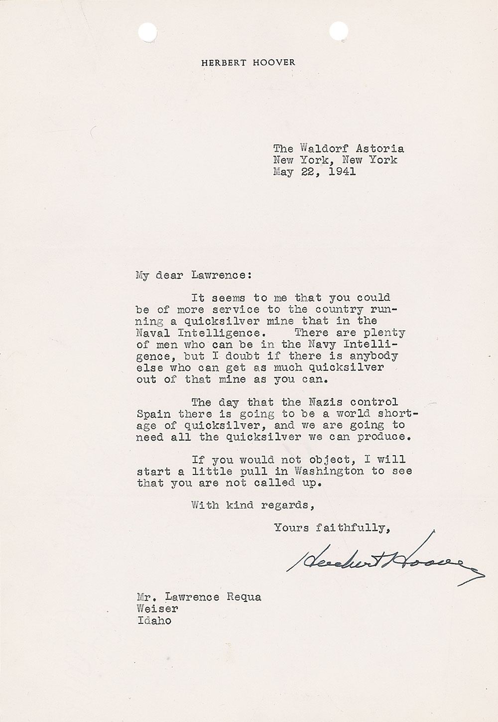 TLS, one page, 7.25 x 10.5, personal letterhead, May 22, 1941. Letter to Lawrence Requa of Idaho. In full: "It seems to me that you could be of more service to the country running a quicksilver mine that [sic] in the Naval Intelligence. There are plenty of men who can be in the Navy Intelligence, but I doubt if there is anybody else who can get as much quicksilver out of that mine as you can. The day that the Nazis control Spain there is going to be a world shortage of quicksilver, and we are going to need all the quicksilver we can produce. If you would not object, I will start a little pull in Washington to see that you are not called up." In fine condition, with filing holes to the top.