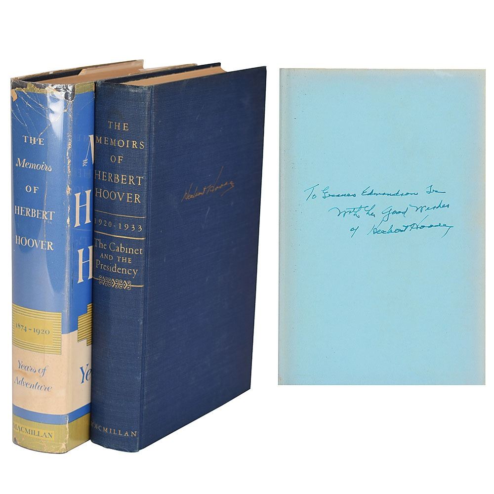 Signed book: The Memoirs of Herbert Hoover: Years of Adventure, 1874–1920. Later printing. NY: Macmillan, 1952. Hardcover with dust jacket, 6.5 x 9.5, 496 pages. Signed and inscribed on the first free end page in fountain pen. Includes an unsigned second printing of the second volume of Hoover's Memoirs: The Cabinet and the Presidency, 1920–1933. In very good to fine condition, with tears and creases to the dust jacket on volume one, and volume two missing its dust jacket.