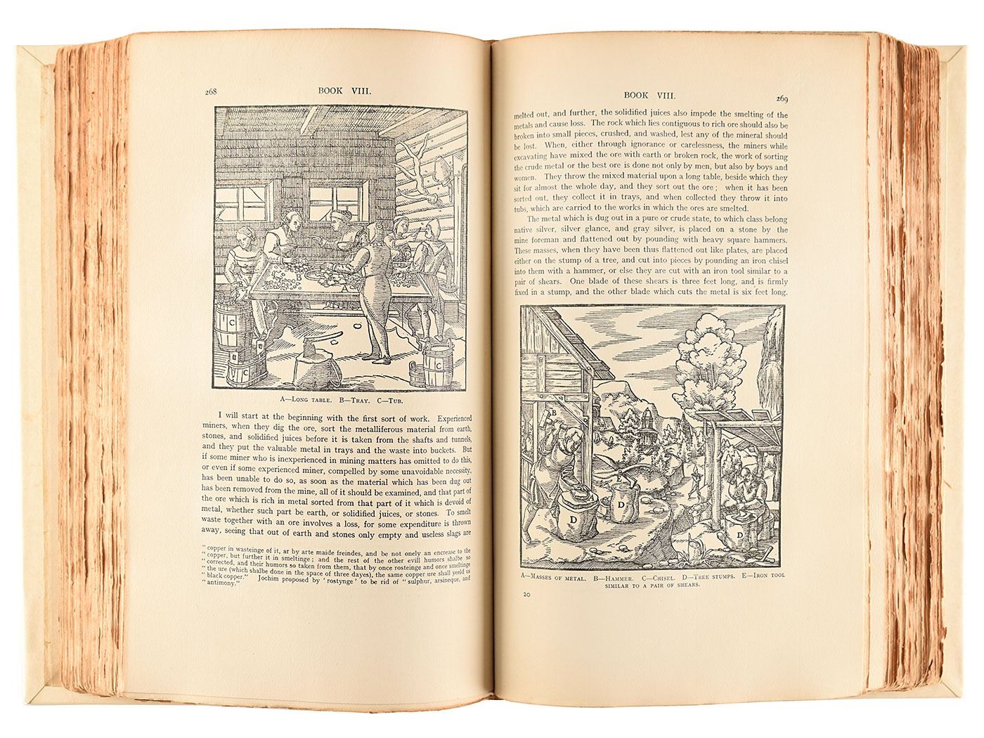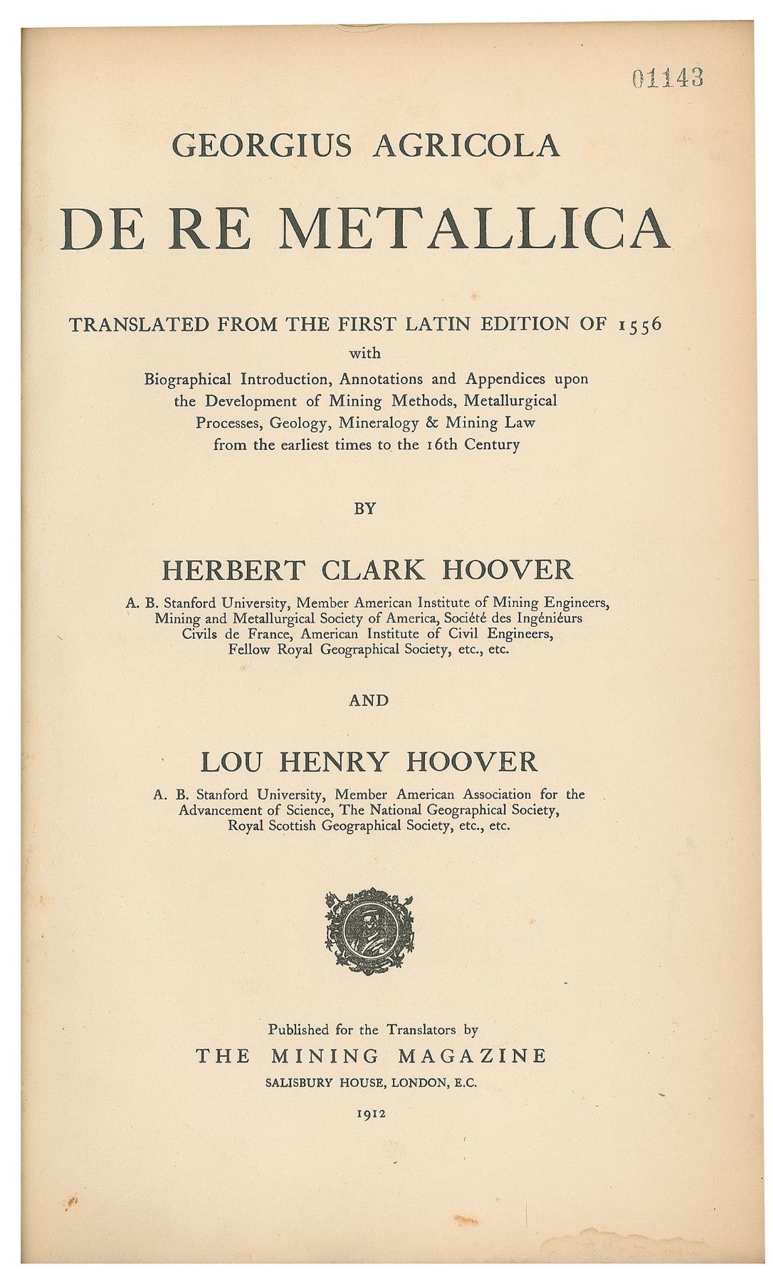 Signed book: De Re Metallica. London: The Mining Magazine, 1912. Custom-rebound hardcover, 9.25 x 13.75, 640 pages. Signed and inscribed on the first free end page in ink, "To Alfred Merton, Esq., With Compliments, H. C. Hoover." In very good to fine condition, with toning and foxing to the signed page. An impressively large volume containing Hoover's early translation of this classic 1556 text on mining.