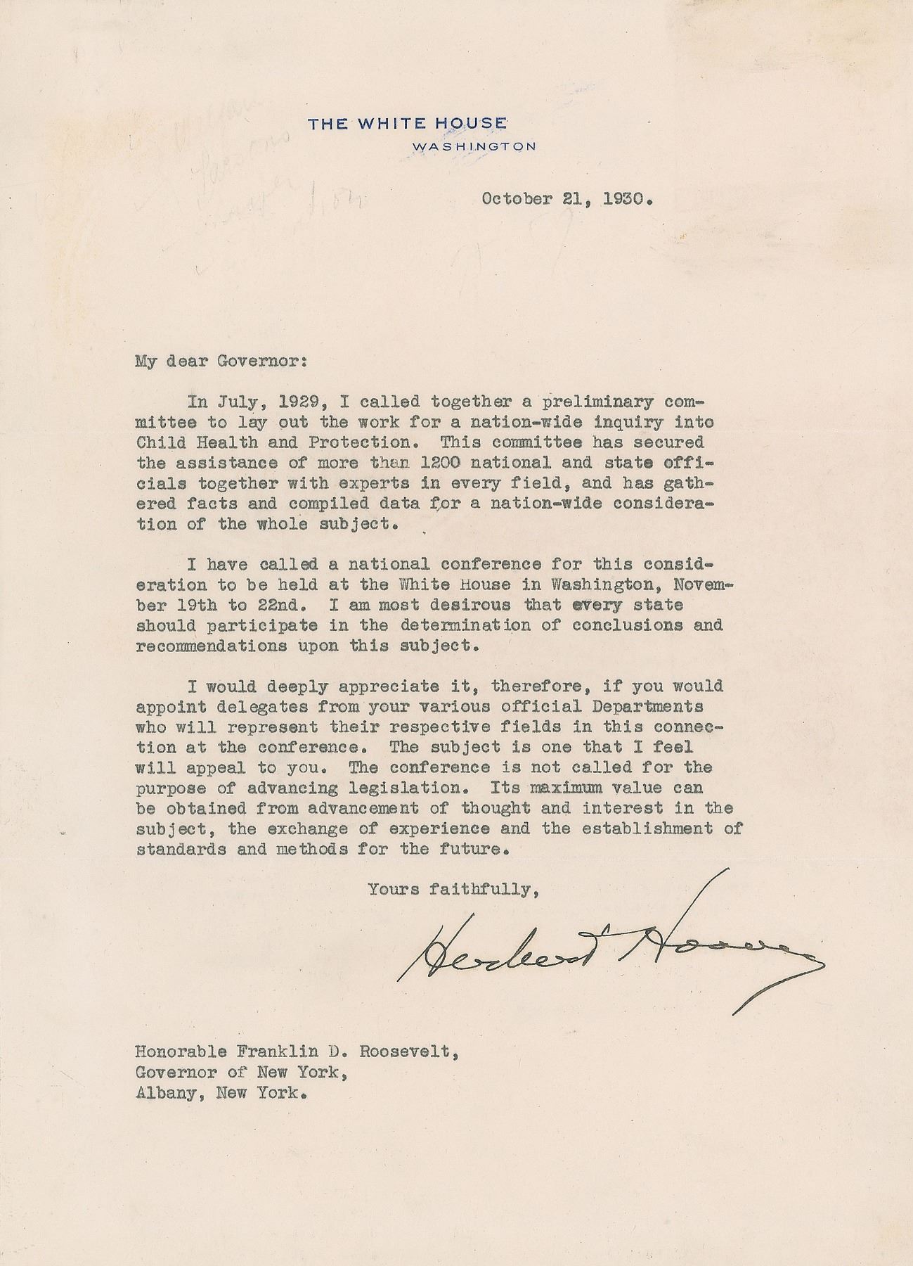 TLS as president, one page, 7.5 x 10.5, White House letterhead, October 21, 1930. Letter to his successor, New York Governor Franklin D. Roosevelt, inviting him to a White House conference, in full: "In July, 1929, I called together a preliminary committee to lay out the work for a nation-wide inquiry into Child Health and Protection. This committee has secured the assistance of more than 1200 national and state officials together with experts in every field, and has gathered facts and compiled data for a nation-wide consideration of the whole subject.