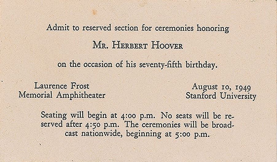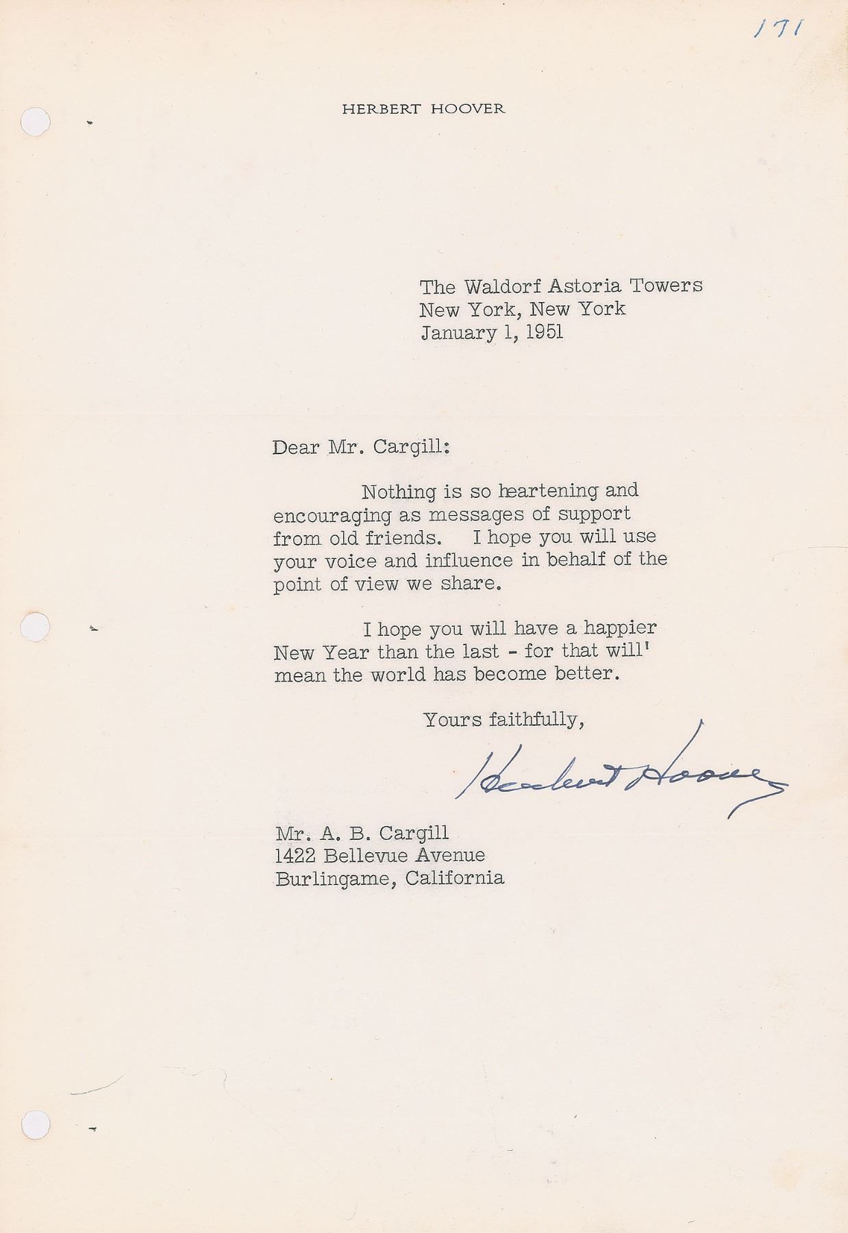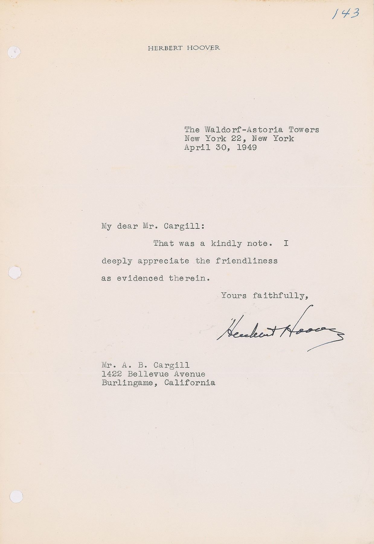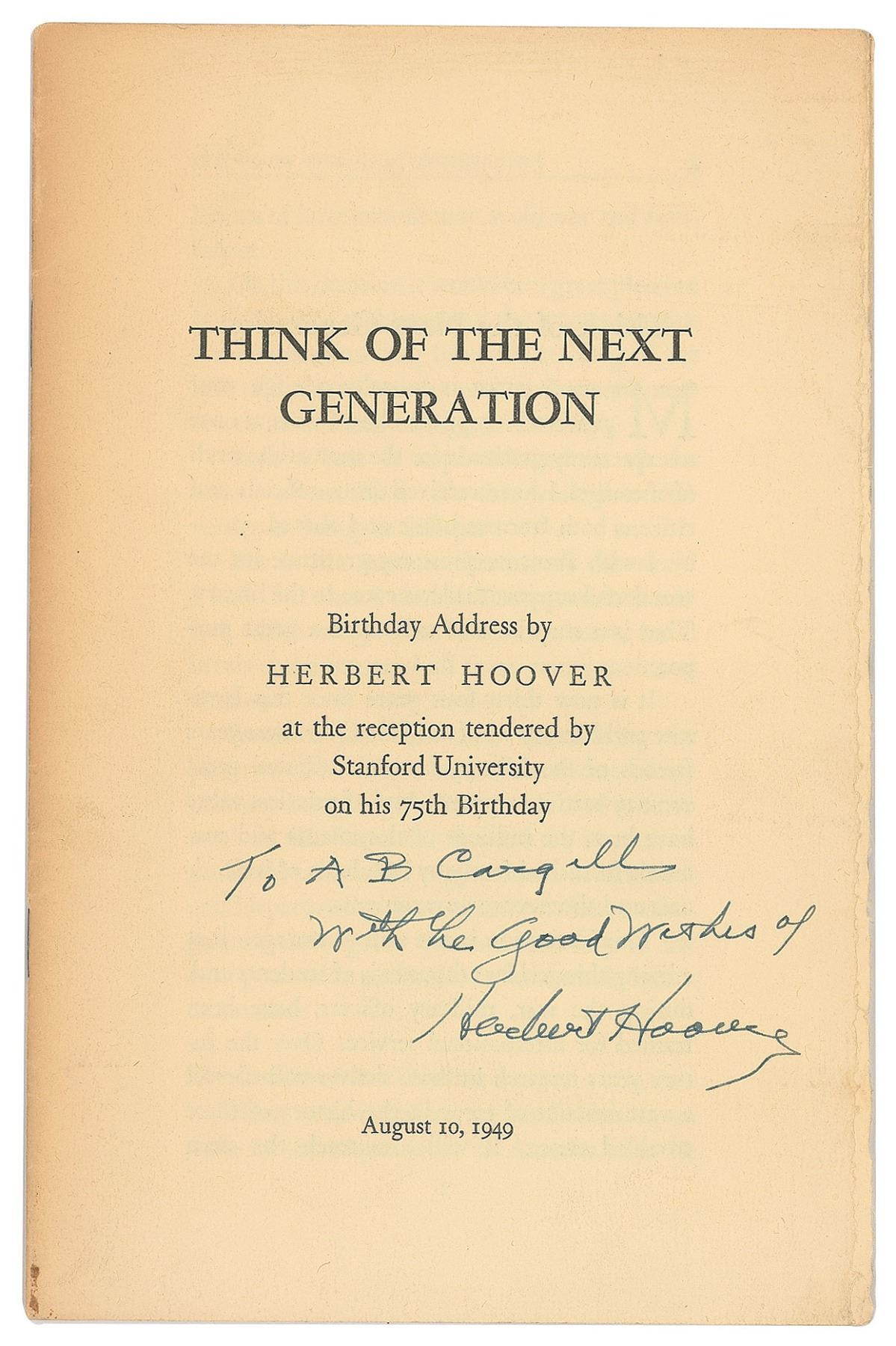 Three items signed by Hoover: a booklet entitled "Think of the Next Generation: Birthday Address by Herbert Hoover," August 10, 1949, 15 pages, 5.5 x 8.5, signed and inscribed on the front cover in fountain pen, "To A. B. Cargill, With the good wishes of Herbert Hoover," with an admission card to Hoover's address; a TLS to Cargill, one page, 7.25 x 10.5, personal letterhead, April 30, 1949, in full: "That was a kindly note. I deeply appreciate the friendliness as evidenced therein"; and a TLS to Cargill, one page, 7.25 x 10.5, personal letterhead, January 1, 1951, in part: "Nothing is so heartening and encouraging as messages of support from old friends. I hope you will use your voice and influence in behalf of the point of view we share." In fine condition, with file holes to the left edges of the letters.