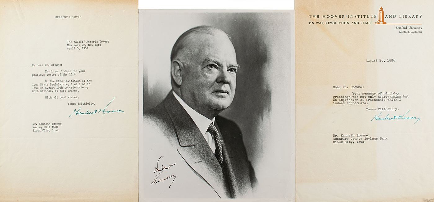 Three items signed by Hoover: a glossy 8 x 10 portrait, signed in fountain pen; a TLS, one page, personal letterhead, April 5, 1954, in part: "On the kind invitation of the Iowa State Legislature, I will be in Iowa on August 10th to celebrate my 80th birthday at West Branch"; and a TLS, one page, Hoover Institute letterhead, August 18, 1956, in full: "Your message of birthday greetings was not only heartwarming but an expression of friendship which I indeed appreciated." In overall very good condition, with overall creasing and surface impressions to the photo, and toning to the letters. Accompanied by the original mailing envelopes for the letters, and a booklet bearing a pre-printed facsimile signature on the cover.