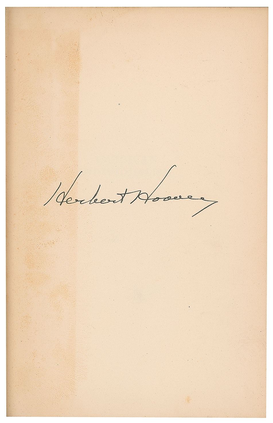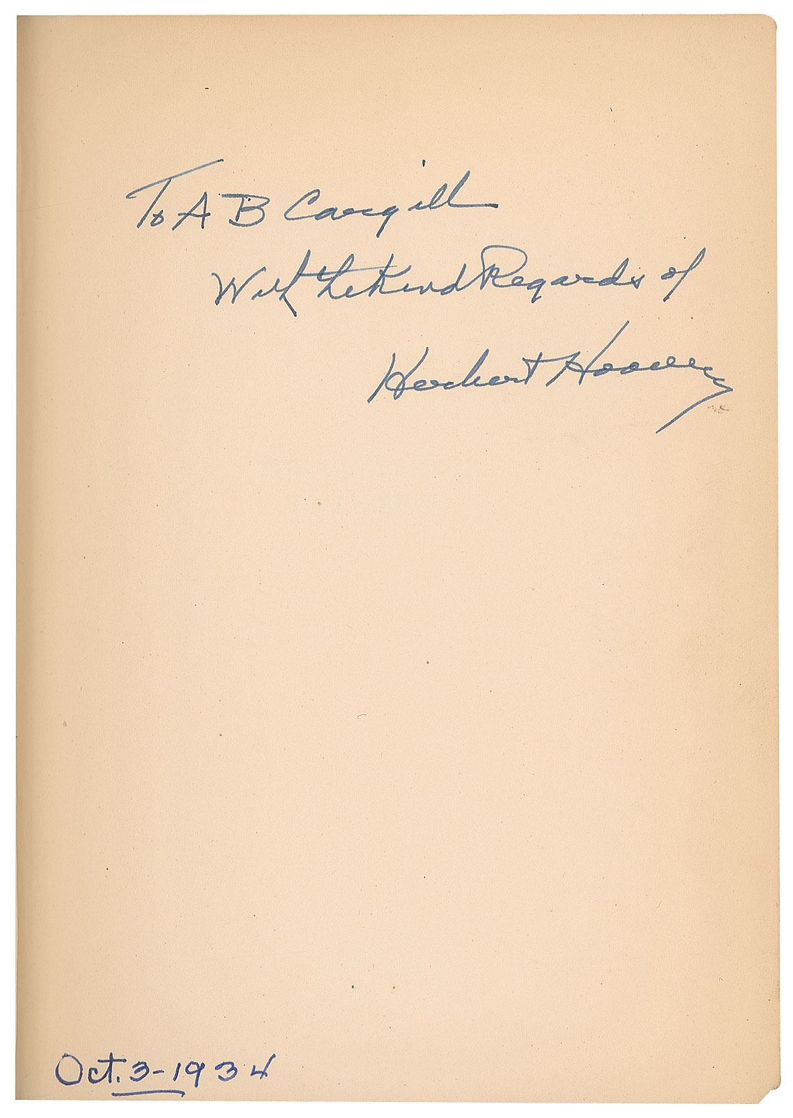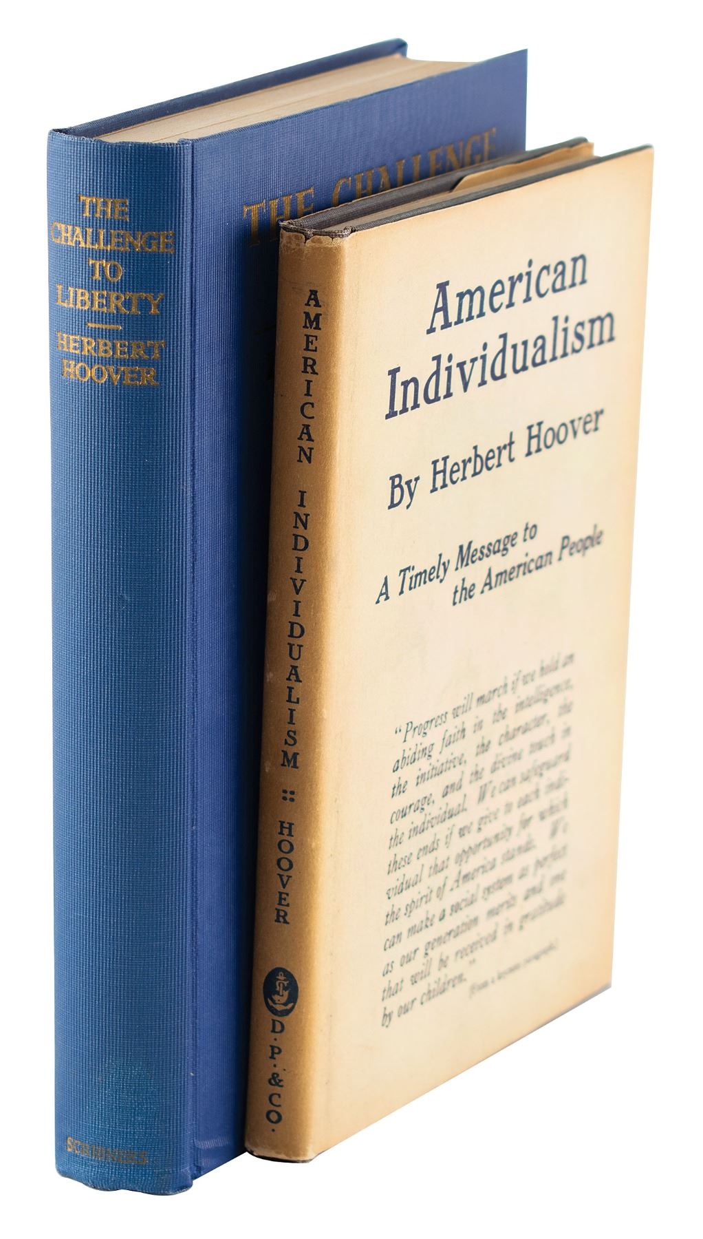 Two first edition books: The Challenge to Liberty, hardcover with glassine jacket, published by Charles Scribner's Sons in 1934, signed and inscribed on the first free end page in fountain pen, "To A. B. Cargill, with the kind regards of Herbert Hoover"; and American Individualism, hardcover with dust jacket, published by Doubleday, Page & Company in 1922, signed on the first free end page in fountain pen, "Herbert Hoover." In very good to fine condition, with toning, tears, and losses to the jacket of The Challenge to Liberty; and toning to the signed page and dust jacket of American Individualism.