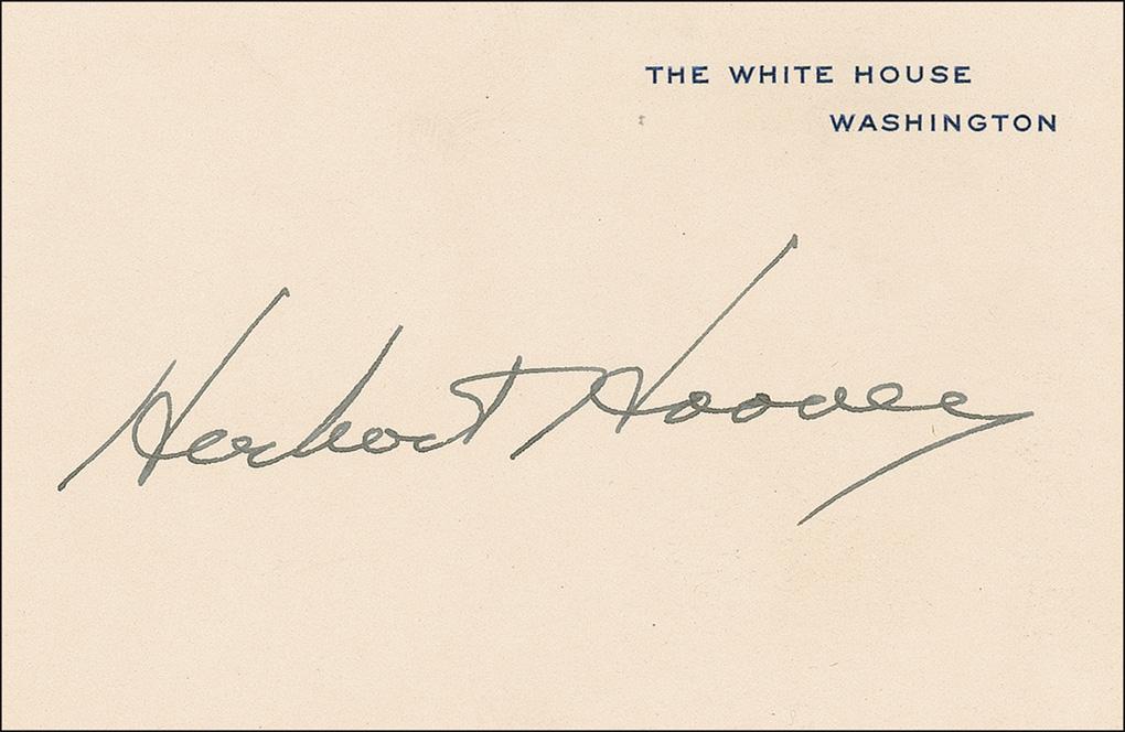 Signed White House card, signed in black ink, “Herbert Hoover.” In fine condition, with a mild shade of toning and single mounting remnant to reverse.