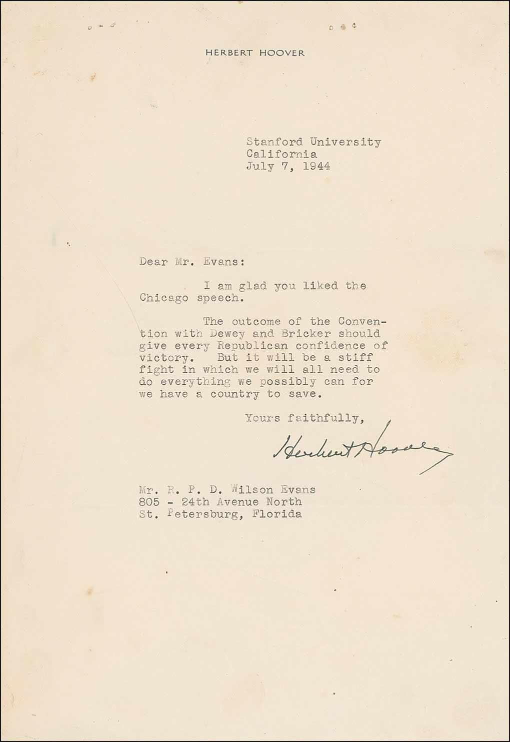 TLS, one page, 7.25 x 10.5, personal letterhead, July 7, 1944. Letter to a political supporter. In full: “I am glad you liked the Chicago speech. The outcome of the Convention with Dewey and Bricker should give every Republican confidence of victory. But it will be a stiff fight in which we will all need to do everything we possibly can for we have a country to save.” In very good condition, with staple holes to top edge, and scattered toning and wrinkling.