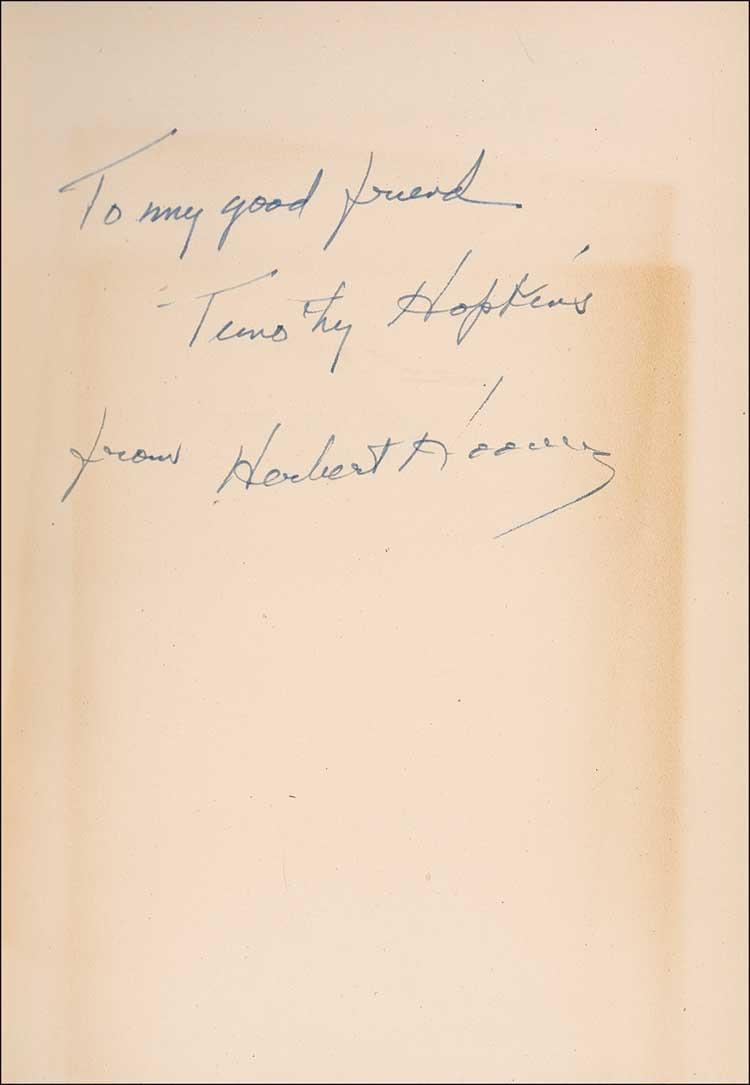 Signed book: The Challenge to Liberty. First edition, first printing. NY: Charles Scribner’s Sons, 1934. Hardcover, 5.75 x 8, 212 pages. Signed and inscribed on the first free end page, “To my good friend Timothy Hopkins from Herbert Hoover.” In very good condition, with toning to signed page, as well as inside covers, and some slight bowing to covers, as well as light wear. Pre-certified John Reznikoff/PSA/DNA and RRAuction COA.