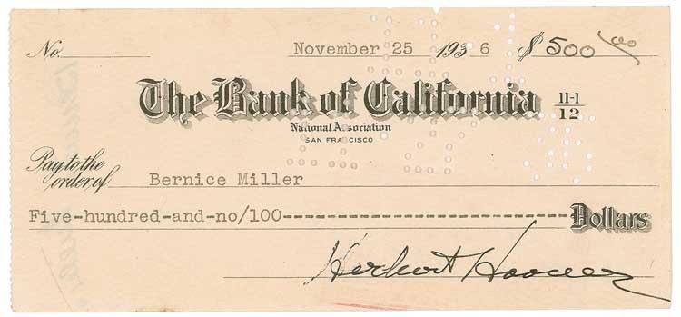 Exceedingly rare bank check, 6 x 2.75, filled out in type and signed by Hoover, payable to Bernice Miller for $500.00, November 25, 1936. Miss Bernice Miller was the former President’s personal secretary for almost 30 years. When he died in 1964 at the age of 90, Hoover left her a bequest of $5,000 a year. A light vertical fold, through a single letter of signature, expected cancellation holes to body, slight show-through from stamps on reverse, and a light shade of toning, otherwise fine condition. In the last 30 years, only four other Hoover signed checks have appeared at public auction. The most recent of the four, a never-cashed check payable to check collector Waldo C. Moore for one cent, sold at Christie’s New York in 1999 for $6,900. Pre-certified John Reznikoff/PSA/DNA and RRAuction COA.