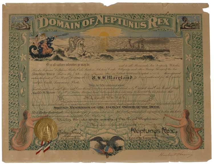 Partly-printed DS, one page, 21.25 x 16.5, November 30, 1928. A Shellback Certificate issued to M. L. Caniff, who was on board the USS Maryland. Document reads, in part: “On this 30th day of November 1928 in Latitude 00000 and Longitude 81.47 W…M. L. Caniff having been found worthy to be numbered as one of our Trusty Shellbacks has been duly initiated into the Solemn Mysteries of the Ancient Order of the Deep.” Signed in the lower border by Hoover, and countersigned in print by Davey Jones and Neptunus Rex. Uniform moderate toning, scattered paper loss to edges, several edge tears, and seal intact, but torn, otherwise very good condition. Rolled. Pre-certified John Reznikoff/PSA/DNA and RRAuction COA.