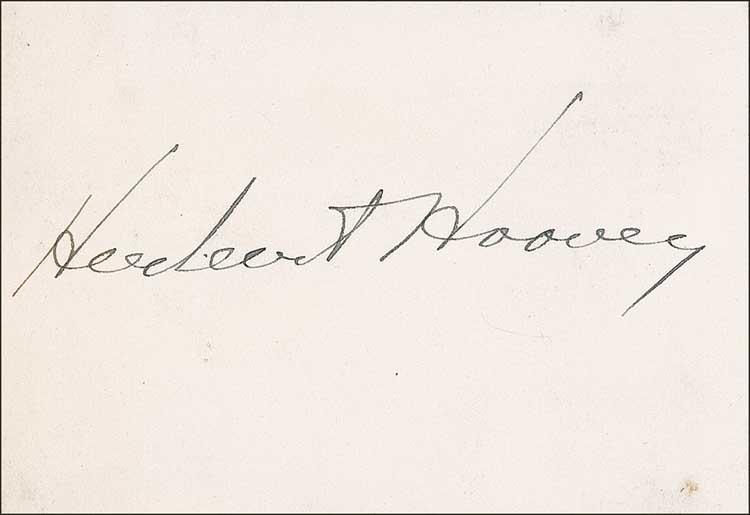 Ink signature, “Herbert Hoover,” on a 3 x 2 card. In fine condition, with mounting remnants on reverse. Pre-certified John Reznikoff/PSA/DNA and RRAuction COA.