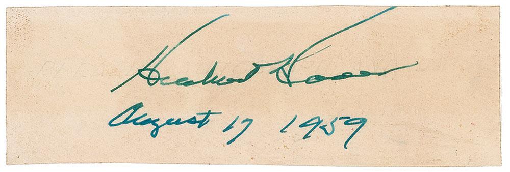 Ink signature, “Herbert Hoover, August 17, 1959,” on an off-white 5.5 x 1.75 slip. Accompanied by an original color drawing of Hoover, which is matted to an overall size of 16 x 20. In fine condition, with scattered light toning. Pre-certified John Reznikoff/PSA/DNA and RRAuction COA.