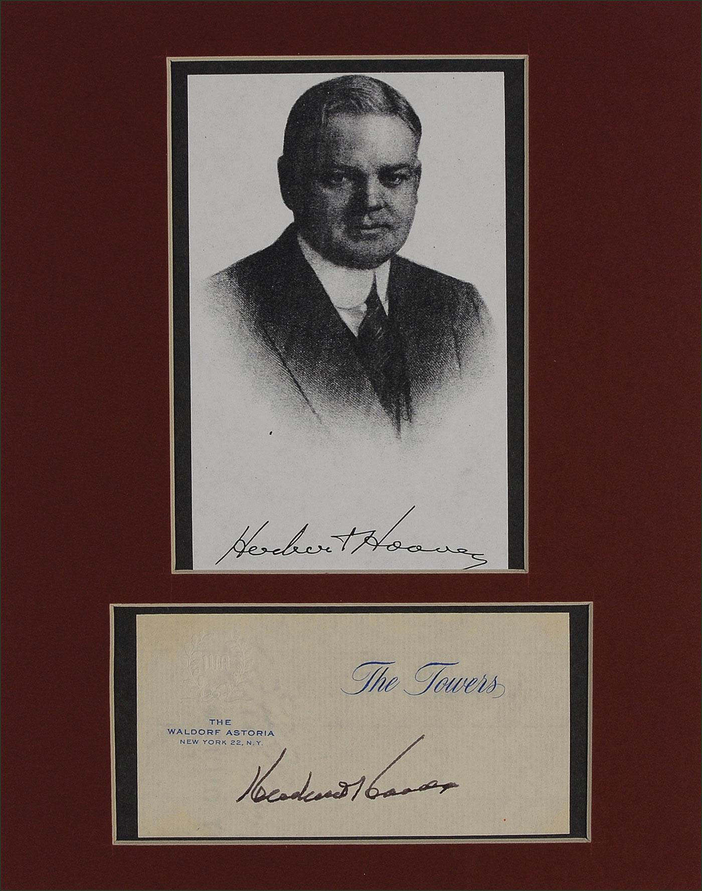 Ink signature, “Herbert Hoover,” on an off-white 5 x 2.5 trimmed sheet of The Towers, Waldorf Astoria stationery affixed to a larger black mount. Matted with a photocopied image of Hoover to an overall size of 8 x 10.25. In fine condition, with a bit of mild toning.