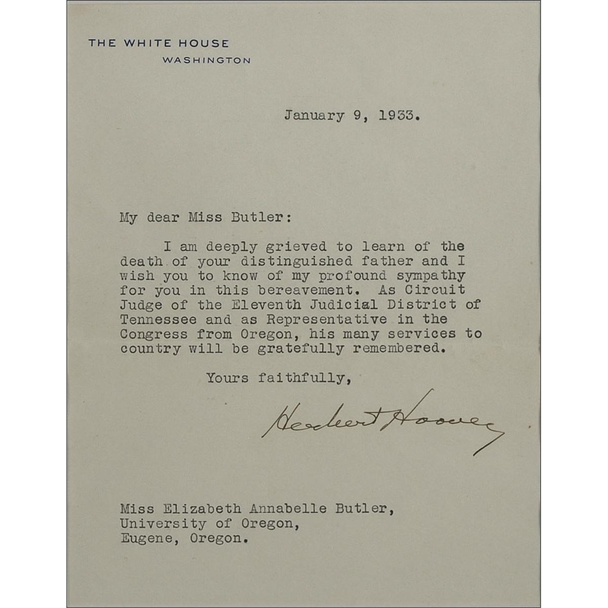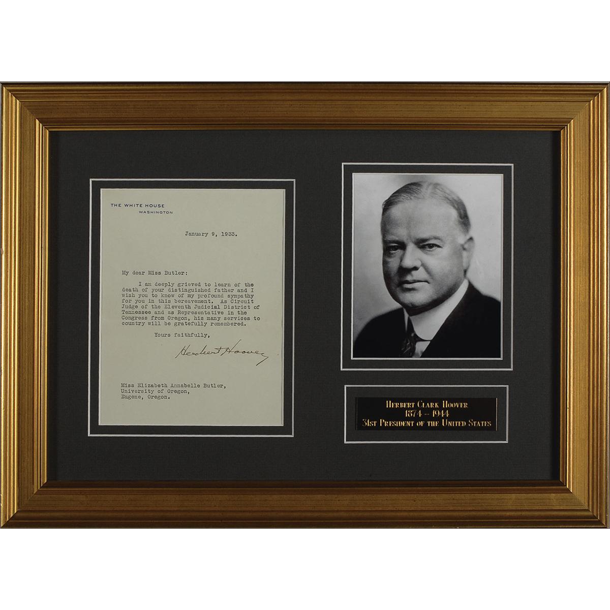 TLS as president, one page, 5.5 x 7, White House letterhead, January 9, 1933. Letter to the daughter of a recently deceased politician. In full: “I am deeply grieved to learn of the death of your distinguished father and I wish you to know of my profound sympathy for you in this bereavement. As Circuit Judge of the Eleventh Judicial District of Tennessee and as a Representative in the Congress from Oregon, his many services to country will be greatly remembered.” Archivally double matted and framed with a portrait of Hoover and a name plaque to an overall size of 18.25 x 13.5. In fine condition. Accompanied by the original White House mailing envelope.