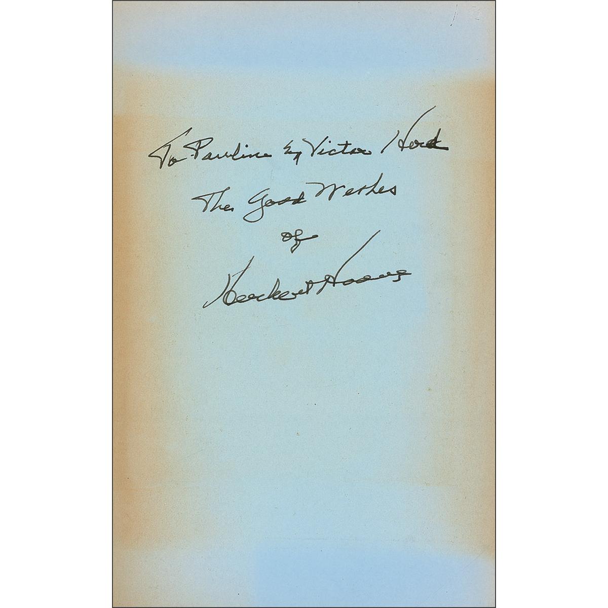 Signed book: The Memoirs of Herbert Hoover 1874–1920. First edition, first printing. NY: The Macmillan Company, 1951. Hardcover with dustjacket, 6.5 x 9.5, 496 pages. Signed and inscribed in black fountain pen on the light blue first free end page, “For Pauline and Victor Herd, The good wishes of Herbert Hoover.” A block of irregular toning on the first free end page over the sentiment and signature, a strip of toning to the front board, and Pauline Herd’s bookplate affixed to the inside front cover, otherwise fine condition. The dustjacket shows clipped corners, chipping, and sunning of the spine.