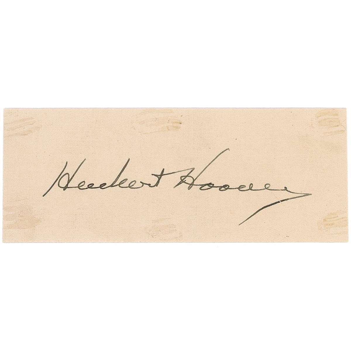 Ink signature, “Herbert Hoover,” on an off-white 4.25 x 1.75 slip. Light spots of adhesive remnants to edges and corners, otherwise fine condition.