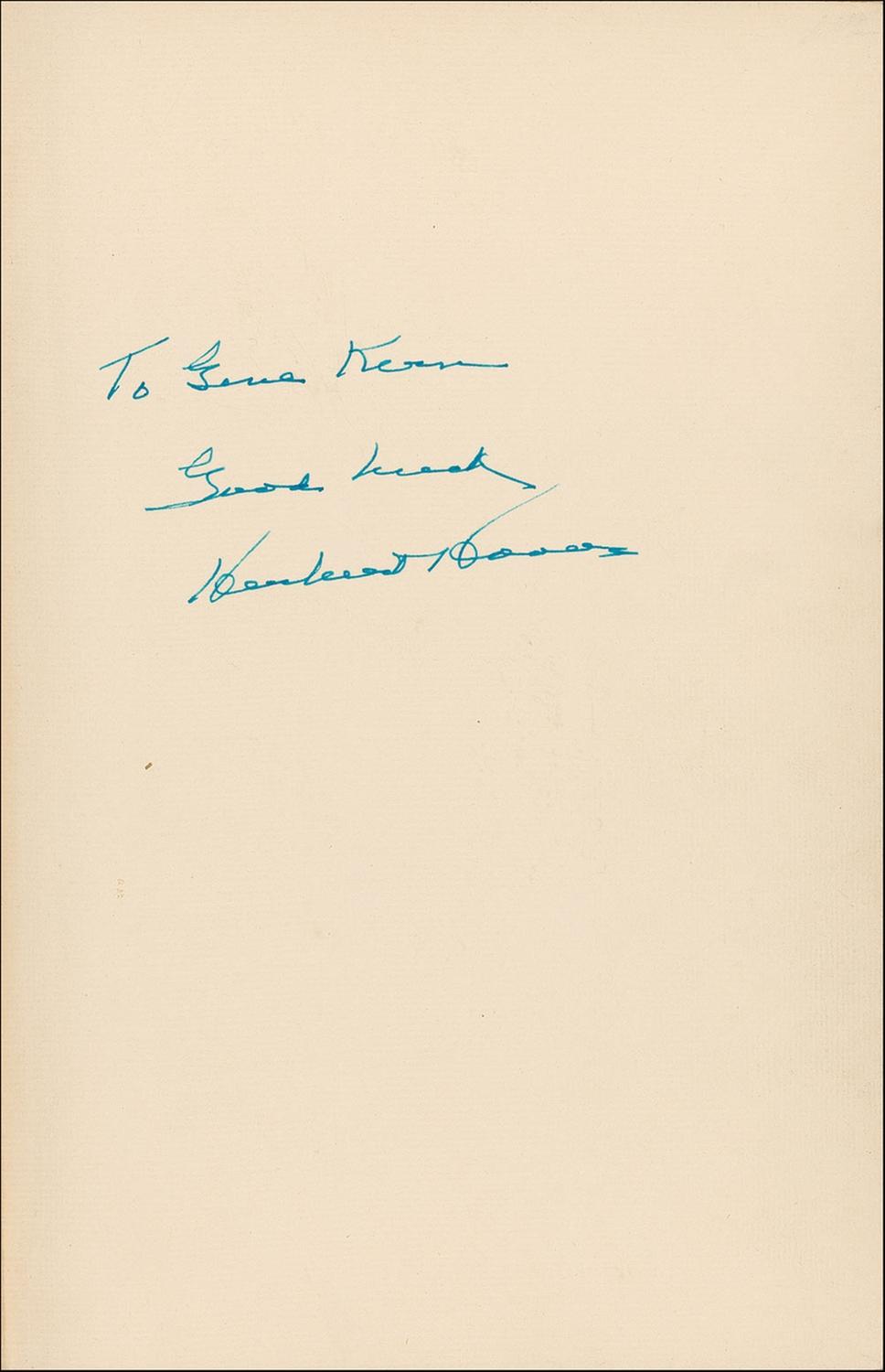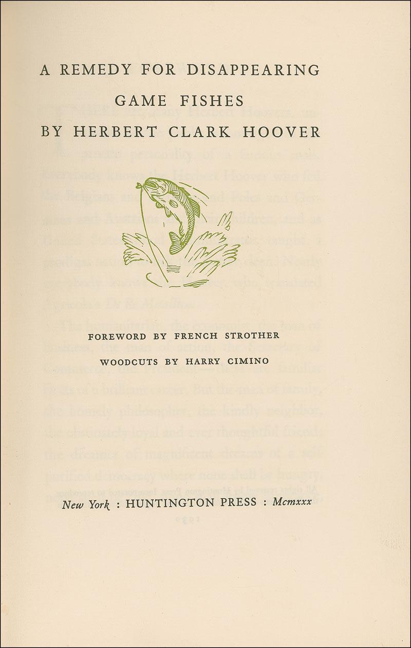 Signed book: A Remedy for Disappearing Game Fishes. Limited first edition of 990 copies (this being no. 836). NY: Huntington Press, 1930. Hardcover with slipcase, 6.5 x 9.75, 41 pages. Signed and inscribed on the first free end page, “To Gene Kern, Good luck, Herbert Hoover.” In fine condition, with pencil notations and some light soiling to front pastedown. Slipcase is very good, with some partial edge separations, a missing edge piece, and wear and toning to spine.