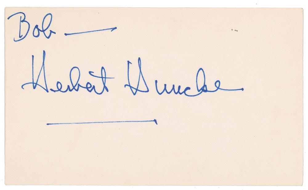 Beat Generation poet (1915–1996) writer, poet, and a sub-culture icon. Felt tip signature and inscription, “Bob—Herbert Huncke,” on an off-white 5 x 3 card. In fine condition.