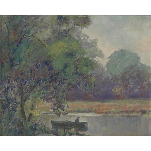 Herbert J.Day (American, early 20th century), Figure in a Rowboat, c.1930;oil/canvas,16in. x 20in., signed.Day worked in Illinois and Indiana, and exhibited at the Art Institute of Chicago in the 1920s.