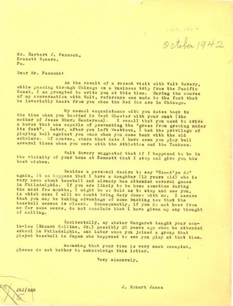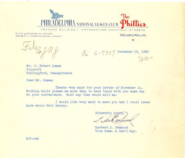 Herbert J. Pennock, Hall of Fame pitcher who threw 35 shutouts. a letter from Pennock on his Phillies stationary as General manager, dated November 12, 1946 signed in fountain pen, to a J. Robert James in reference to meeting for lunch and finding out more about Walt Savery. Also, with copy of a letter sent by James,four years earlier in refernce to meeting with Pennock, seeing him play many years before and in refernce to a possible visit.