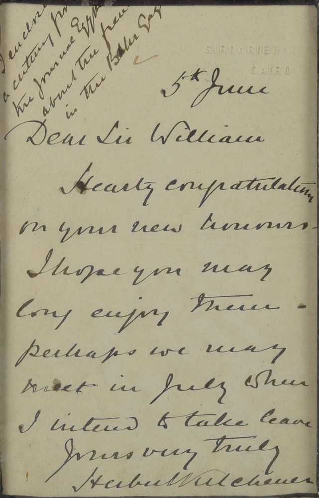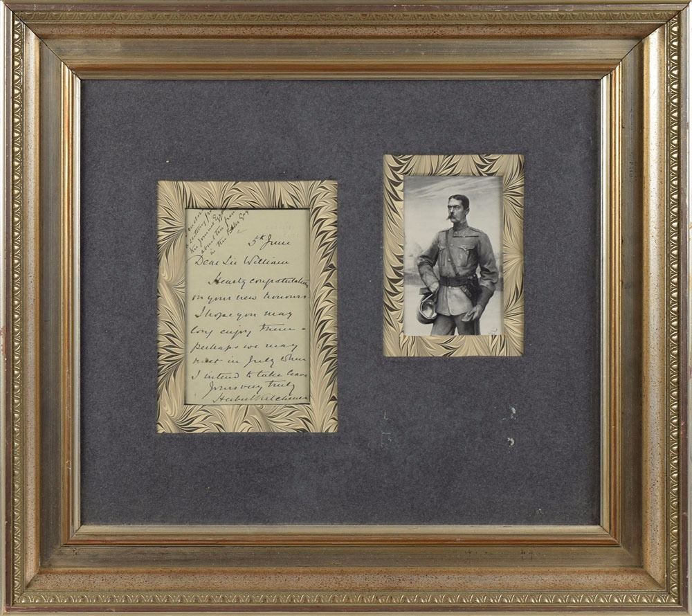 Senior British Army officer and colonial administrator (1850–1916) who earned notoriety for his imperial campaigns, in particular his scorched earth policy against the Boers and his establishment of concentration camps during the Second Boer War. ALS signed “Herbert Kitchener,” one page, 4.25 x 6.75, June 5, no year. Letter to Sir William, in full: "Hearty congratulations on your new honours. I hope you may long enjoy them—perhaps we may meet in July when I intend to take leave." Kitchener adds a brief line to the upper left. Double-matted and framed to an overall size of 23.25 x 20.75. In fine condition.