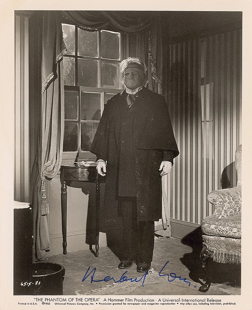 Glossy 8 x 10 Universal Pictures promotional photo for The Phantom of the Opera, signed in blue felt tip. In fine condition, with mild scattered bends and creases and some creasing to the corner tips.