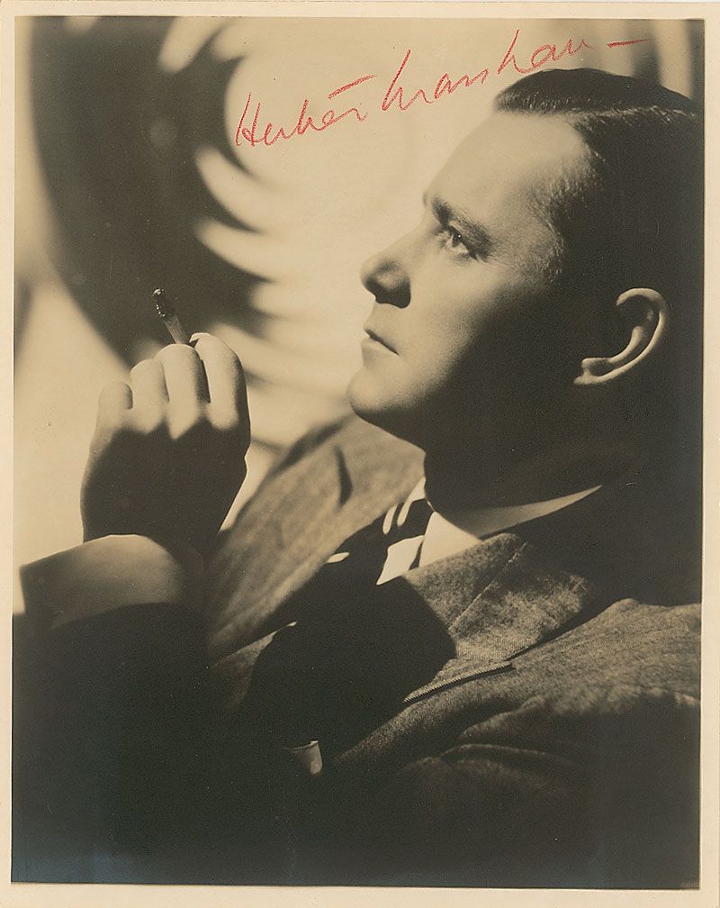 Vintage matte-finish 8 x 10 photo of Marshall holding a smoldering cigarette, signed in red artist’s pencil. In fine condition, with some scattered light silvering to darker areas.