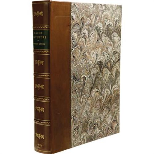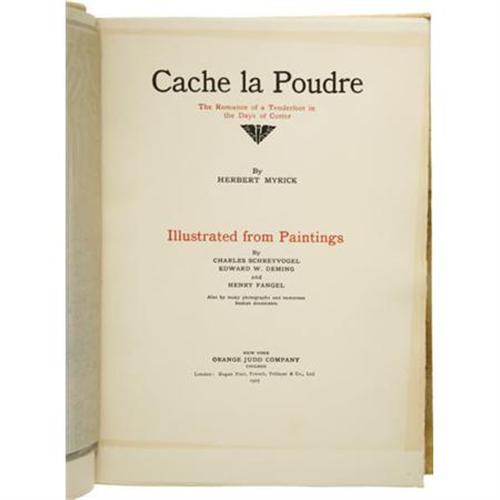 <B>Herbert Myrick: A Wonderful First Edition, Large Paper Issue Bound in Indian Smoke Tanned Buckskin of <I>Cache la Poudre.</B></I></B></I> The Romance of a Tenderfoot in the Days of Custer. Illustrated from Paintings by Charles Schreyvogel, Edward W. Deming and Henry Fangel. Also by many photographs and numerous human documents. (New York, Chicago: Orange Judd Company; London: Kegan Paul, Trench, Trubner & Co., 1905). First edition, large paper issue, limted to five hundred numbered copies. Profusely and beautifully illustrated with mounted plates and photographs, and with illustrations in the text. In the publisher's unique binding of Indian smoke tanned buckskin, complete with fringe on the front board, and illustrated and lettered in brown. A fine copy of a sumptuous production. One mounted plate with small creases to the edge, else an absolutely beautiful book. Housed and protected in a custom quarter brown leather over marbled boards clamshell case, book-backed with spine in six compartments with five raised bands, and lettered and tooled in gilt.<BR><BR><b>Shipping:</b> Books & Catalogs (<a target="_blank" href="http://www.heritageauctions.com/common/shipping.php">view shipping information</a>)