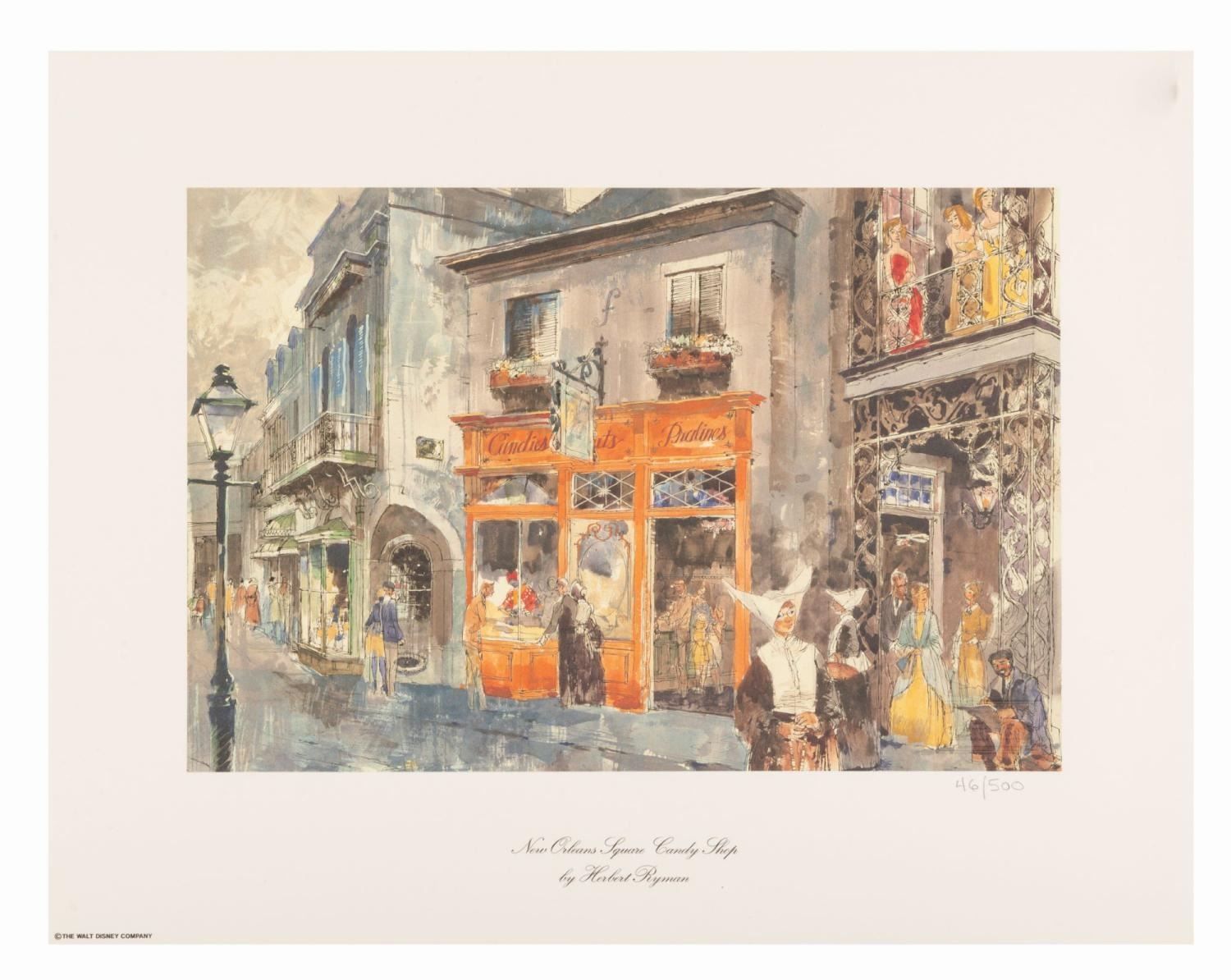 (Disneyland, 1994) A limited edition lithographic print of a seldom-seen concept painting for the New Orleans Square Disneyland expansion by Imagineer Herb Ryman. Colloquially titled, "New Orleans Square Candy Shop," the print is hand-numbered in pencil at lower left, "46/500," and is accompanied by a Disney Gallery COA. Measuring approximately 13"x16.5" with an image size of 8.5"x12.5", the piece is in fine condition with minimal wear.