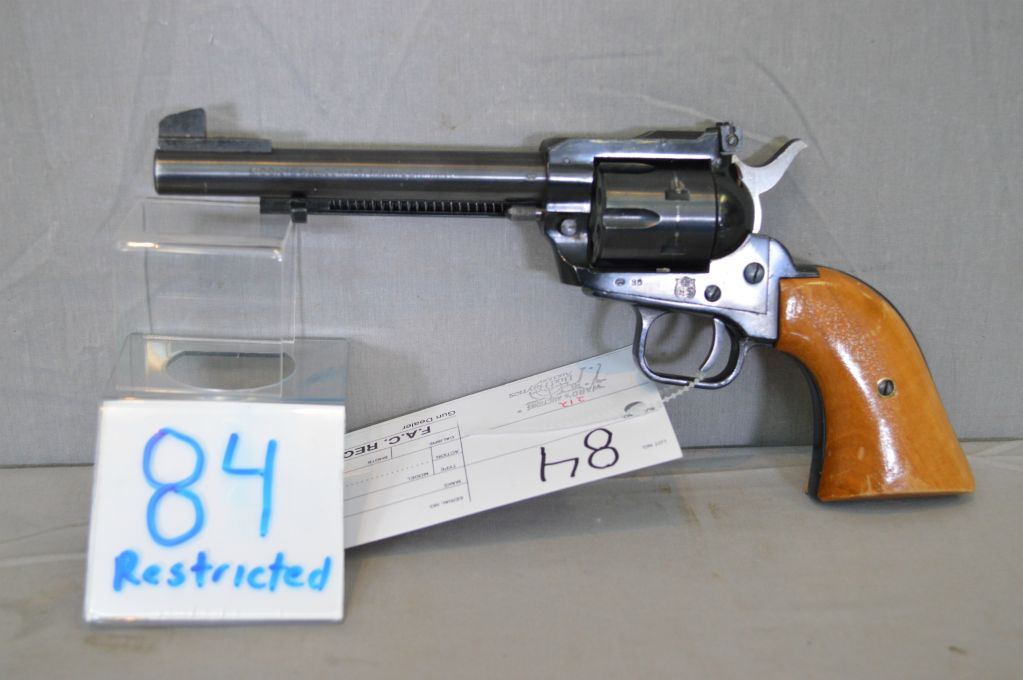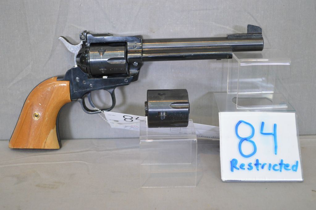 Herbert Schmidt Mod 21S Texas Scout .22 LR cal & .22 Mag cal 6 shot Revolver w/ 140 mm bbl [ blued finish, adjustable rear sight, chipped right grip that has glued repair , c/w extra cylinder, few marks ] Ser # 763412 Restricted Cert # 4595915