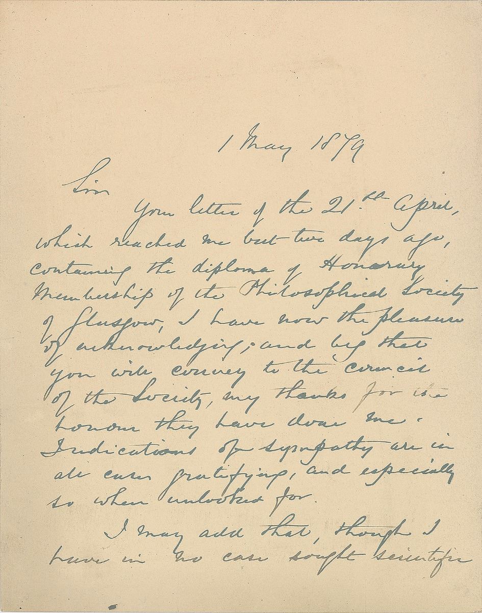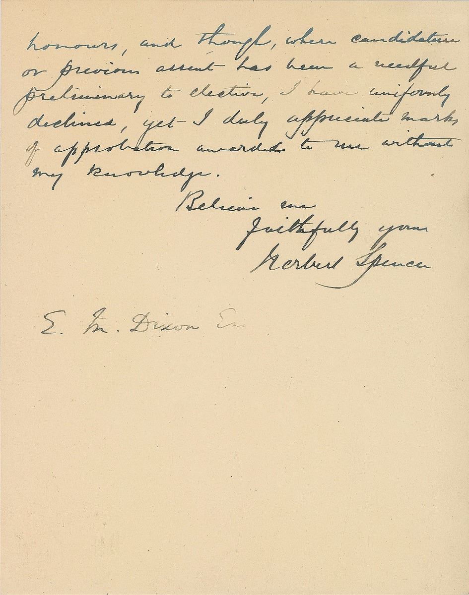 Prominent English philosopher and sociologist (1820–1903). ALS, two pages, 7 x 9, May 1, 1879. Letter to E. M. Dixon. In part: “Your letter…which reached me but two days ago, containing the diploma of Honorary Membership of the Philosophical Society of Glasgow, I have now the pleasure of acknowledging.” In fine condition.