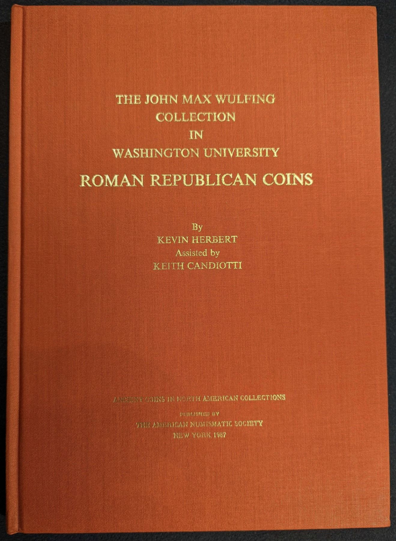 (2) The John Max Wulfing Collection in Washington University: Roman Republican Coins. Herbert, Kevin, and Keith Candiotti. 1987. 4to. New York. original russet cloth, gilt. (6), 47, (1) pages. 25 fine plates. Fine. American Numismatic Society, Ancient Coins in North American Collections No. 7. This book represents an illustrated catalogue in a format which follows that of the Sylloge Nummorum Graecorum fascicules, differing only in that it allows for dates, of 769 Roman Republican coins which John Max Wulfung donated to the Department of Classics of Washington University in 1928. Lot weight: 2 lbs 7oz. Subject(s): Ancient Coinage.
